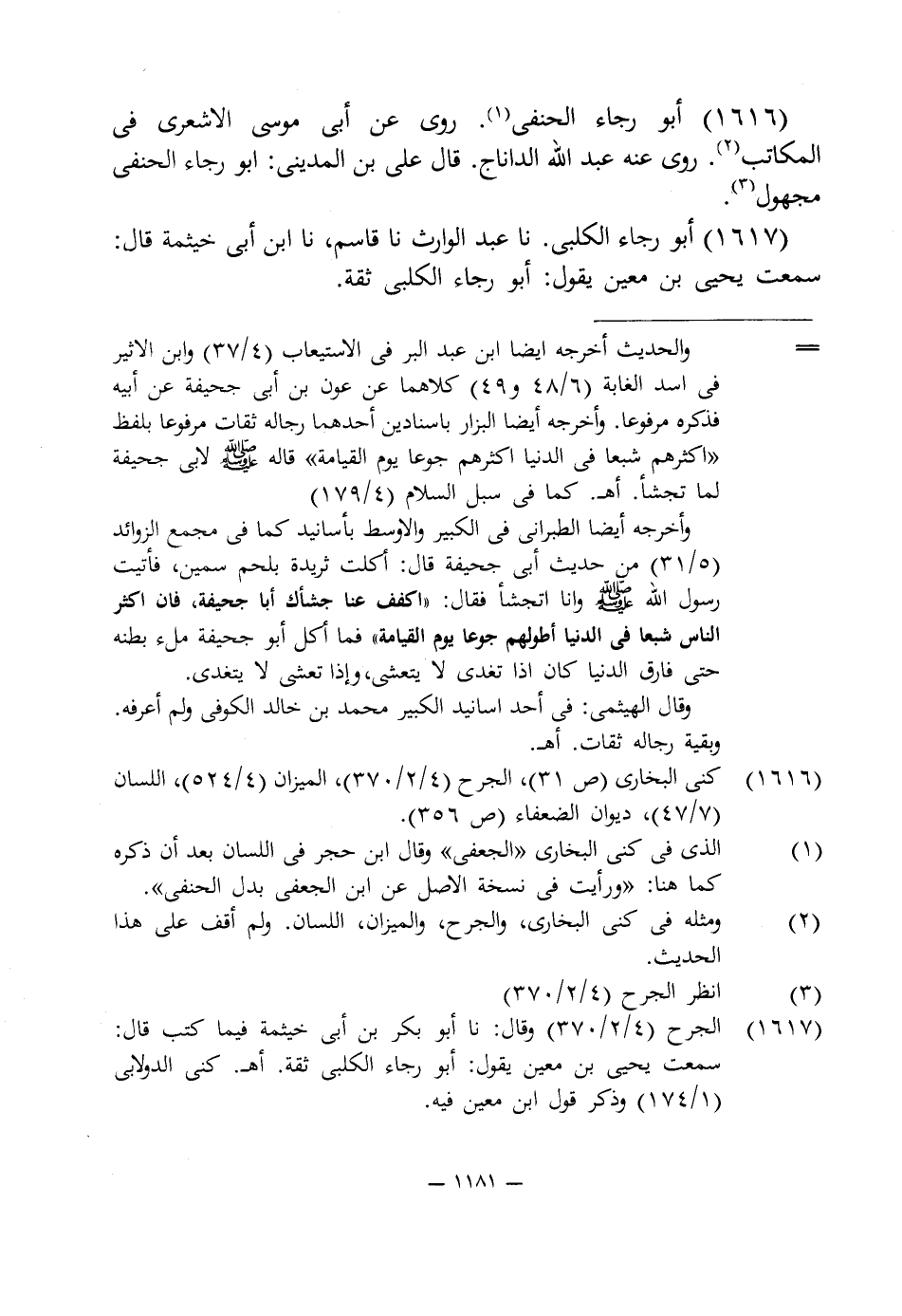1616 - أبو رجاء الحنفى (¬1). روى عن أبى موسى الاشعرى في المكاتب (¬2). روى عنه عبد اللَّه الداناج. قال على بن المدينى: أبو رجاء الحنفى مجهول (¬3).