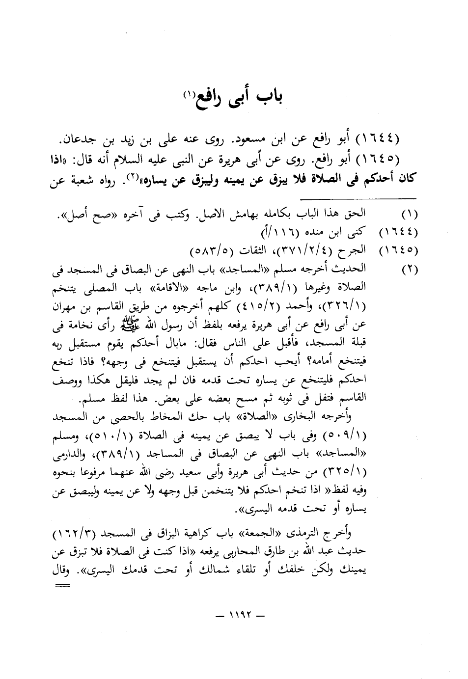 1645 - أبو رافع. روى عن أبى هريرة عن النبى عليه السلام أنه قال: "إذا كان أحدكم في الصلاة فلا يبزق عن يمينه وليبزق عن يساره" (¬2). رواه شعبة عن