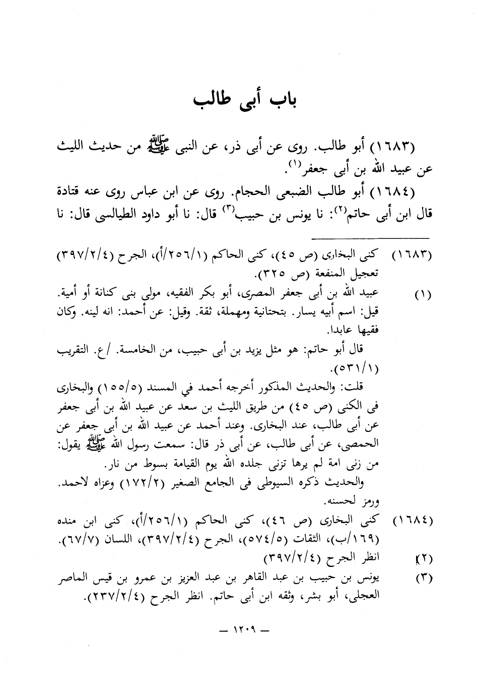 قلت: والحديث المذكور أخرجه أحمد في المسند (5/ 155) والبخارى في الكنى (ص 45) من طريق الليث بن سعد عن عبيد اللَّه بن أبى جعفر عن أبى طالب، عند البخارى. وعند أحمد عن عبيد اللَّه بن أبى جعفر عن الحمصى، عن أبى طالب، عن أبى ذر قال: سمعت رسول اللَّه -صلى اللَّه عليه وسلم- يقول: من زنى امة لم يرها تزنى جلده اللَّه يوم القيامة بسوط من نار.
