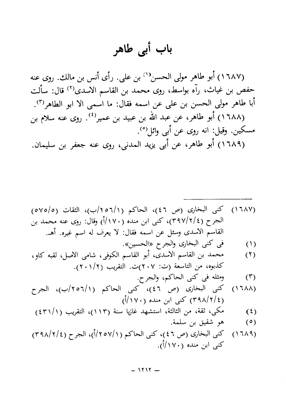 1687 - أبو طاهر مولى الحسن (¬1) بن على. رأى أنس بن مالك. روى عنه حفص بن غياث، رآه بواسط، روى محمد بن القاسم الاسدى (¬2) قال: سألت أبا طاهر مولى الحسن بن على عن اسمه فقال: ما اسمى إلا أبو الطاهر (¬3).