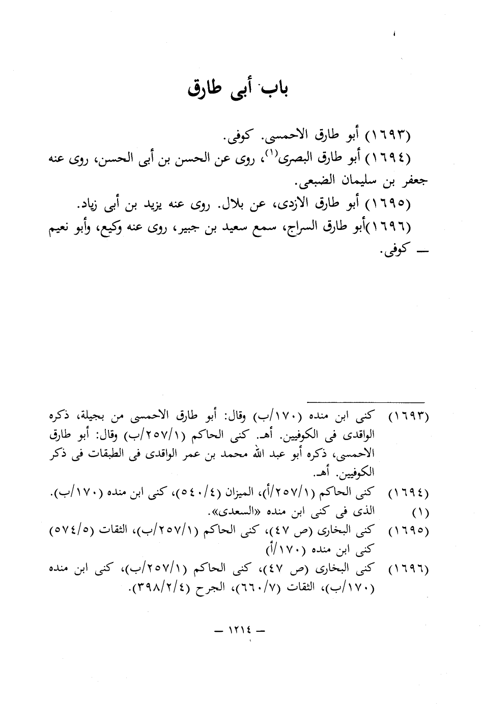 1693 - كنى ابن منده (170/ ب) وقال: أبو طارق الاحمسى من بجيلة، ذكره الواقدى في الكوفيين. اهـ. كنى الحاكم (1/ 257/ ب) وقال: أبو طارق الاحمسى، ذكره أبو عبد اللَّه محمد بن عمر الواقدى في الطبقات في ذكر الكوفيين. اهـ.