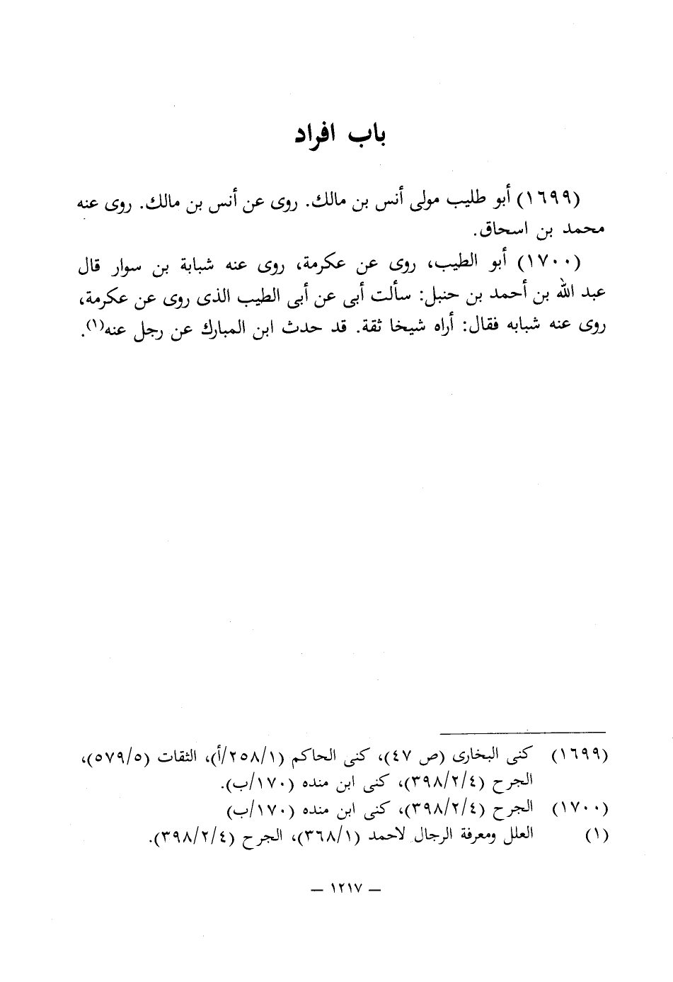 1700 - أبو الطيب، روى عن عكرمة، روى عنه شبابة بن سوار قال عبد اللَّه بن أحمد بن حنبل: سألت أبى عن أبى الطيب الذى روى عن عكرمة، روى عنه شبابه فقال: أراه شيخا ثقة. قد حدث ابن المبارك عن رجل عنه (¬1).