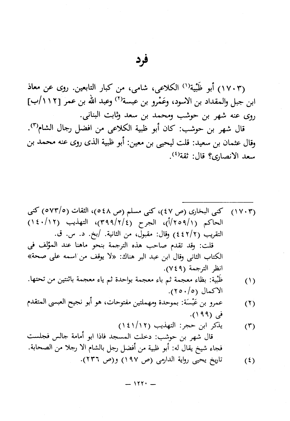 1703 - أبو ظَبْية (¬1) الكلاعى، شامى، من كبار التابعين. روى عن معاذ ابن جبل والمقداد بن الأسود، وعَمْرو بن عبسة (¬2) وعبد اللَّه بن عمر روى عنه شهر بن حوشب ومحمد بن سعد وثابت البنانى.