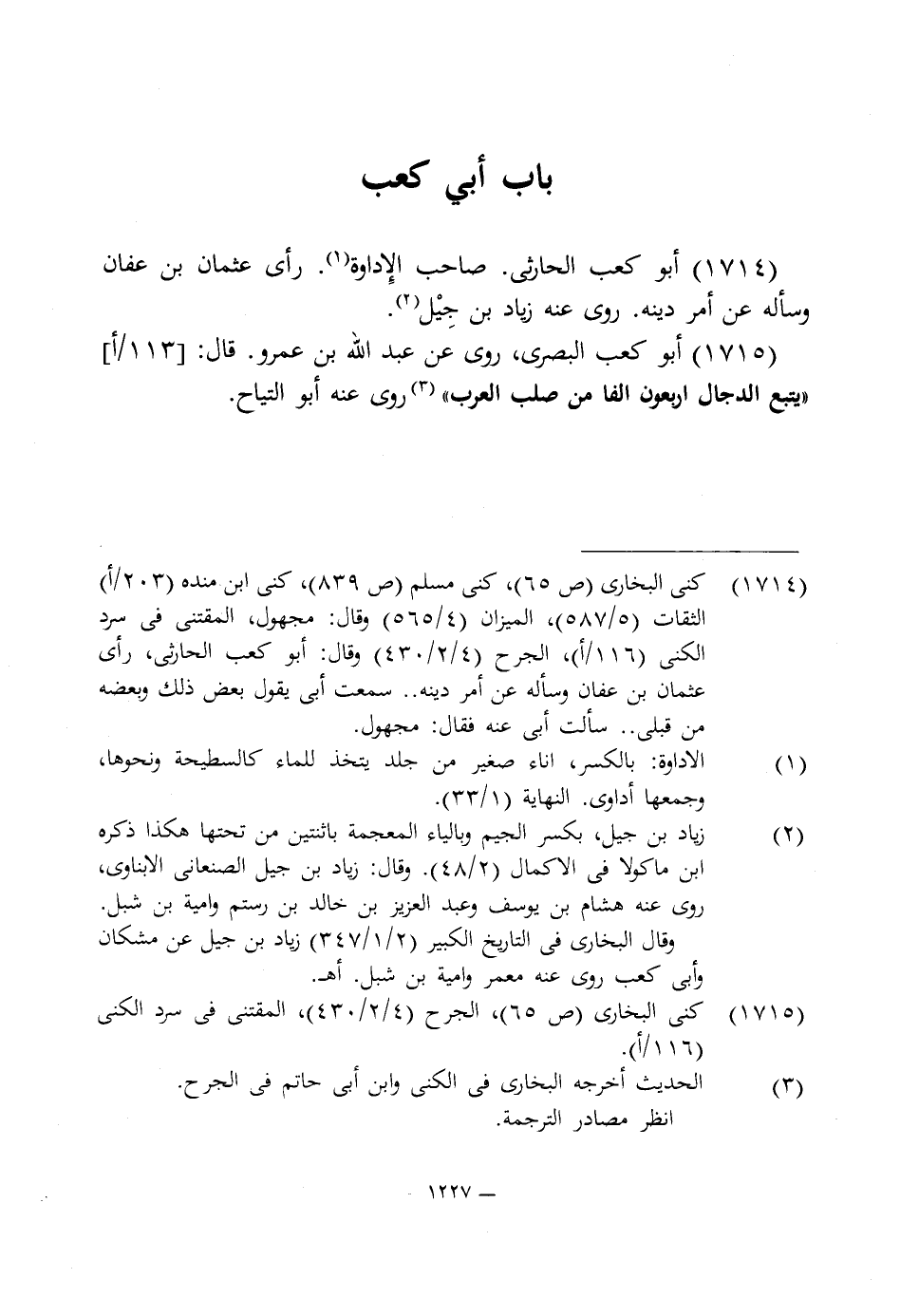174 - كنى البخارى (ص 65)، كنى مسلم (ص 839)، كنى ابن منده (203/ أ) الثقات (5/ 587)، الميزان (4/ 565) وقال: مجهول، المقتنى في سرد الكنى (116/ أ)، الجرح (4/ 2/ 430) وقال: أبو كعب الحارثى، رأى عثمان بن عفان وسأله عن أمر دينه. . سمعت أبى يقول بعض ذلك وبعضه من قبلى. . سألت أبى عنه فقال: مجهول.