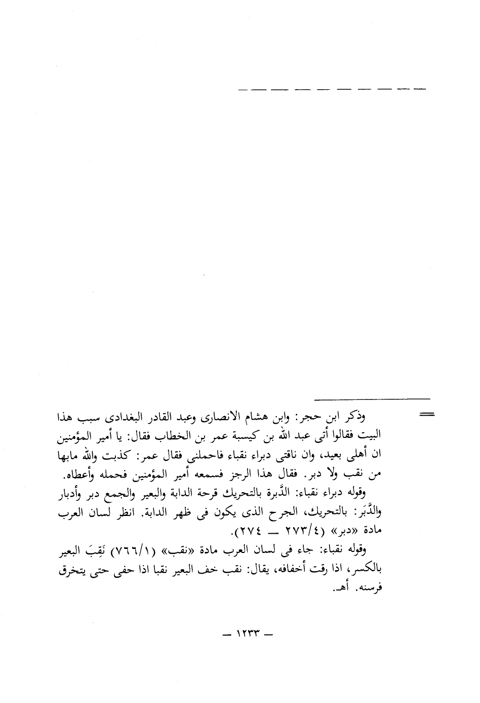 = وذكر ابن حجر: وابن هشام الأنصارى وعبد القادر البغدادى سبب هذا البيت فقالوا أتى عبد اللَّه بن كيسبة عمر بن الخطاب فقال: يا أمير المؤمنين ان أهلى بعيد، وأن ناقتى دبراء نقباء فاحملنى فقال عمر: كذبت واللَّه ما بها من نقب ولا دبر. فقال هذا الرجز فسمعه أمير المؤمنين فحمله وأعطاه.