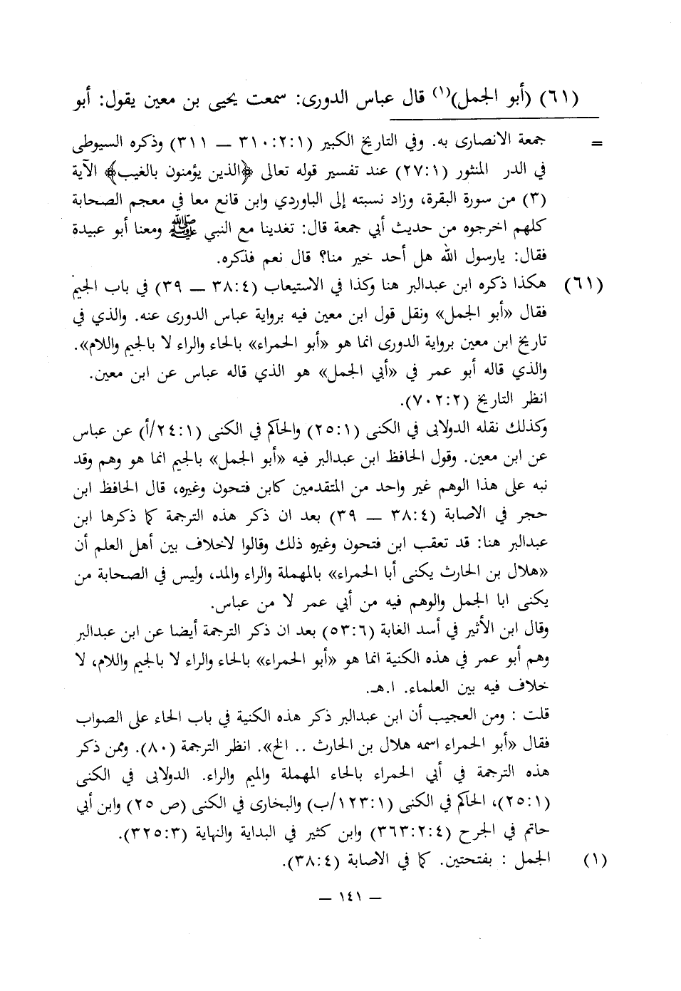 وكذلك نقله الدولابى في الكنى (1: 25) والحاكم في الكنى (1: 24/ أ) عن عباس عن ابن معين. وقول الحافظ ابن عبد البر فيه "أبو الجمل" بالجيم انما هو وهم وقد نبه على هذا الوهم غير واحد من المتقدمين كابن فتحون وغيره، قال الحافظ ابن حجر في الإصابة (4: 38 - 39) بعد أن ذكر هذه الترجمة كما ذكرها ابن عبد البر هنا: قد تعقب ابن فتحون وغيره ذلك وقالوا لا خلاف بين أهل العلم أن "هلال بن الحارث يكنى أبا الحمراء" بالمهملة والراء والمد، وليس في الصحابة من يكنى أبا الجمل والوهم فيه من أبى عمر لا من عباس.