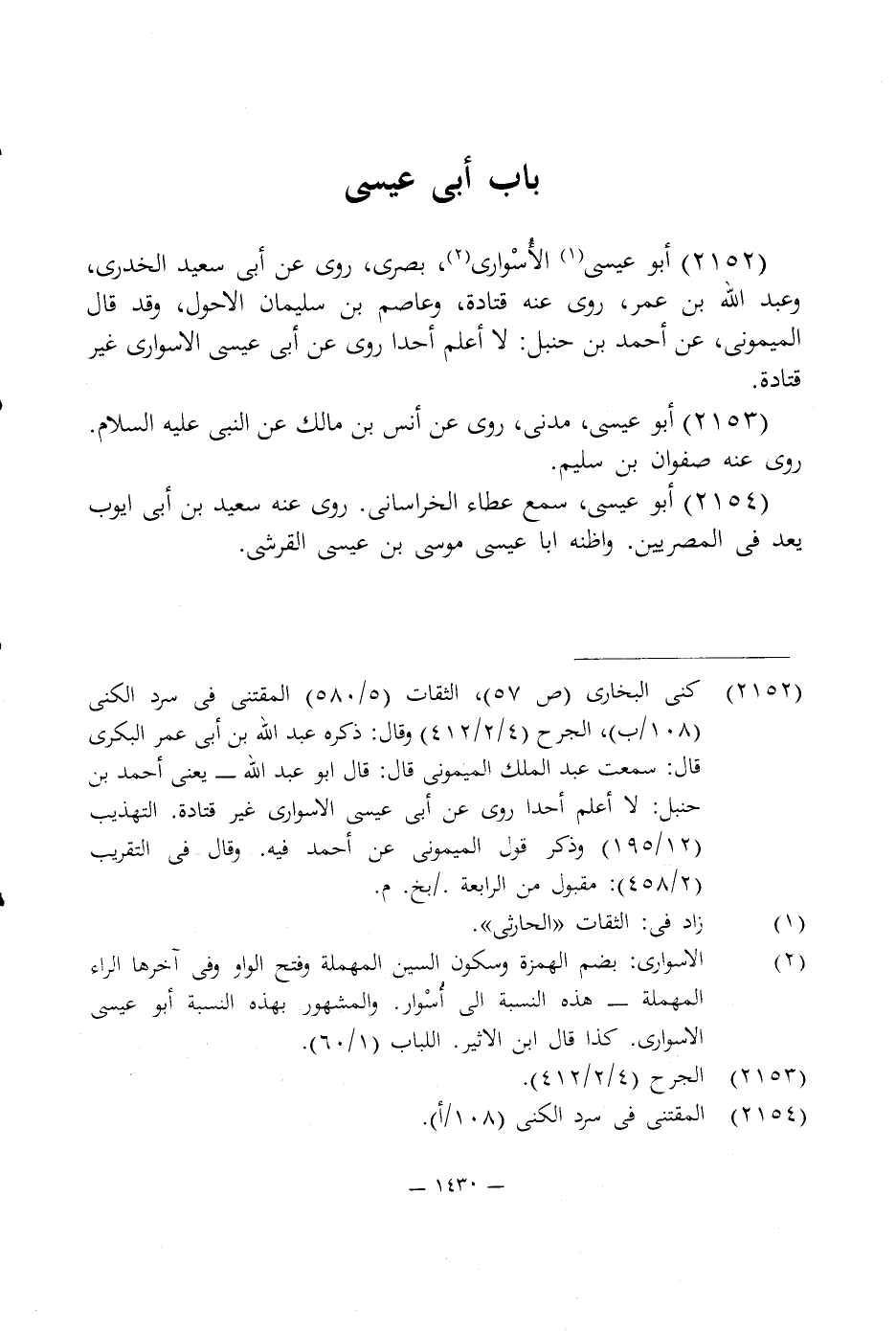 (¬2) الاسوارى: بضم الهمزة وسكون السين المهملة وفتح الواه وفى آخرها الراء المهملة - هذه النسبة إلى أُسْوار. والمشهور بهذه النسبة أبو عيسى الاسوارى. كذا قال ابن الاثير. اللباب (1/ 60).