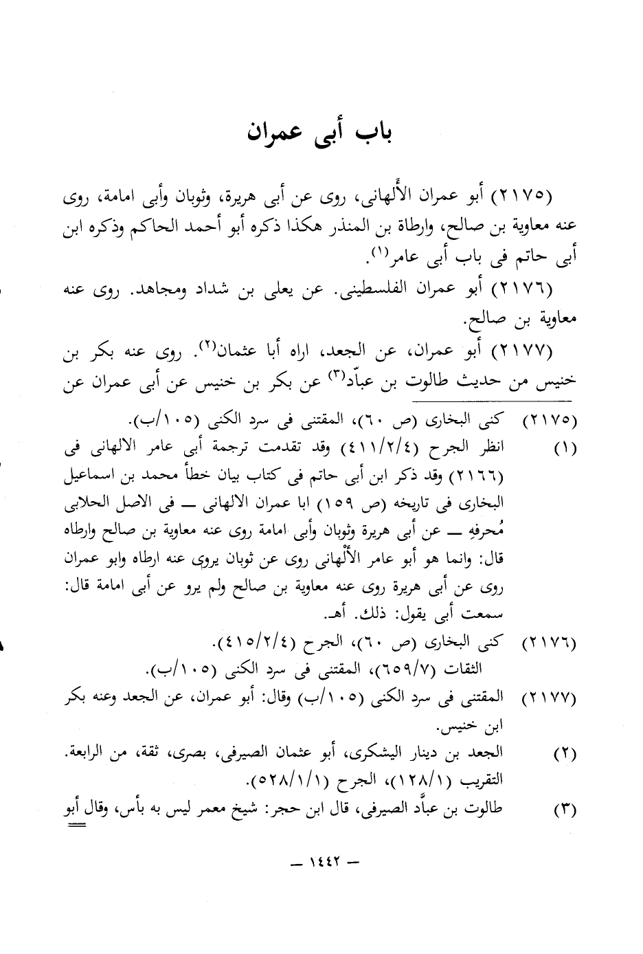 2175 - أبو عمران الأَلهانى، روى عن أبى هريرة، وثوبان وأبى امامة، روى عنه معاوية بن صالح، وارطاة بن المنذر هكذا ذكره أبو أحمد الحاكم وذكره ابن أبى حاتم في باب أبى عامر (¬1).