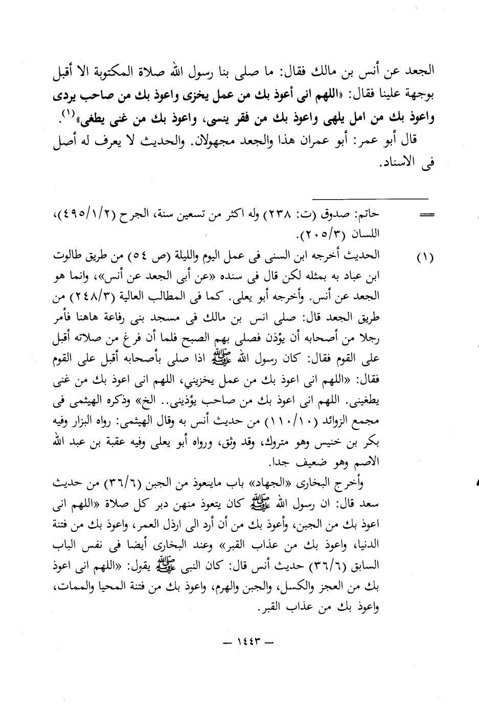 الجعد عن أنس بن مالك فقال: ما صلى بنا رسول اللَّه صلاة المكتوبة إلا أقبل بوجهة علينا فقال: "اللهم إنى أعوذ بك من عمل يخزى وأعوذ بك من صاحب يردى وأعوذ بك من أمل يلهى وأعوذ بك من فقر ينسى، وأعوذ بك من غنى يطغى" (¬1).
