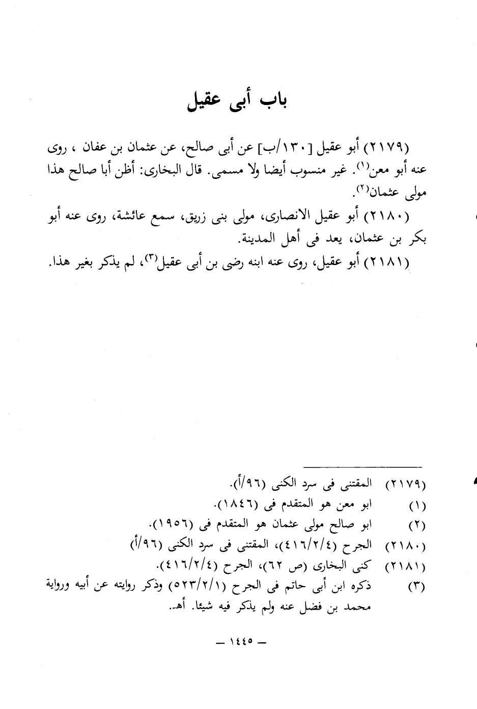 2180 - أبو عقيل الأنصارى، مولى بنى زريق، سمع عائشة، روى عنه أبو بكر بن عثمان، يعد في أهل المدينة.