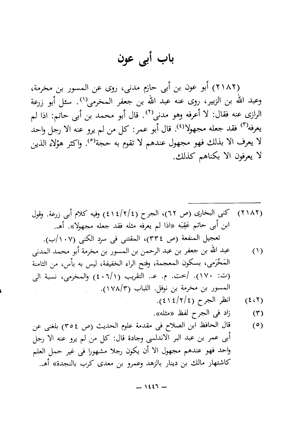 2182 - أبو عون بن أبى حازم مدنى، روى عن المسور بن مخرمة، وعبد اللَّه بن الزبير، روى عنه عبد اللَّه بن جعفر المخرمى (¬1). سئل أبو زرعة الرازى عنه فقال: لا أعرفه وهو مدنى (¬2). قال أبو محمد بن أبى حاتم: إذا يعرفه (¬3) فقد جعله مجهولا (¬4). قال أبو عمر: كل من لم يرو عنه إلا رجل واحد لا يعرف إلا بذلك فهو مجهول عندهم لا تقوم به حجة (¬5). وأكثر هؤلاء الذين لا يعرفون إلا بكناهم كذلك.