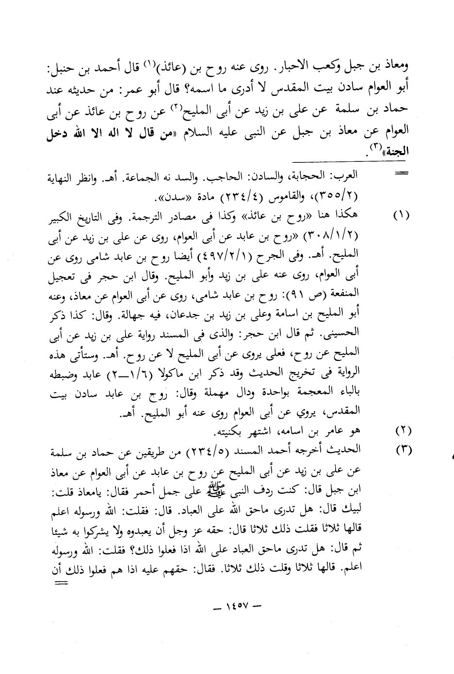 (¬1) هكذا هنا "روح بن عائذ" وكذا في مصادر الترجمة. وفى التاريخ الكبير (2/ 1/ 308) "روح بن عابد عن أبى العوام، روى عن على بن زيد عن أبى المليح. اهـ. وفى الجرح (1/ 2/ 497) أيضا روح بن عابد شامى روى عن أبى العوام، روى عنه على بن زيد وأبو المليح. وقال ابن حجر في تعجيل المنفعة (ص 91): روح بن عابد شامى، روى عن أبى العوام عن معاذ، وعنه أبو المليح بن أسامة وعلى بن زيد بن جدعان، فيه جهالة. وقال: كذا ذكر الحسينى. ثم قال ابن حجر: والذى في المسند رواية على بن زيد عن أبى المليح عن روح، فعلى يروى عن أبى المليح لا عن روح. اهـ. وستأتى هذه الرواية في تخريج الحديث وقد ذكر ابن ماكولا (6/ 1 - 2) عابد وضبطه بالباء المعجمة بواحدة ودال مهملة وقال: روح بن عابد سادن بيت المقدس، يروى عن أبى العوام روى عنه أبو المليح. اهـ.