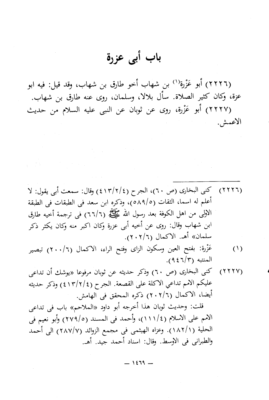 2226 - كنى البخارى (ص 60)، الجرح (4/ 2/ 413) وقال: سمعت أبى يقول: لا أعلم له اسما، الثقات (5/ 589)، وذكره ابن سعد في الطبقات في الطبقة الأولى من أهل الكوفة بعد رسول اللَّه -صلى اللَّه عليه وسلم- (6/ 66) في ترجمة أخيه طارق ابن شهاب وقال: روى عن أخيه أبى عزرة وكان أكبر منه وكان يكثر ذكر سلمان " أهـ. الاكمال (6/ 202).
