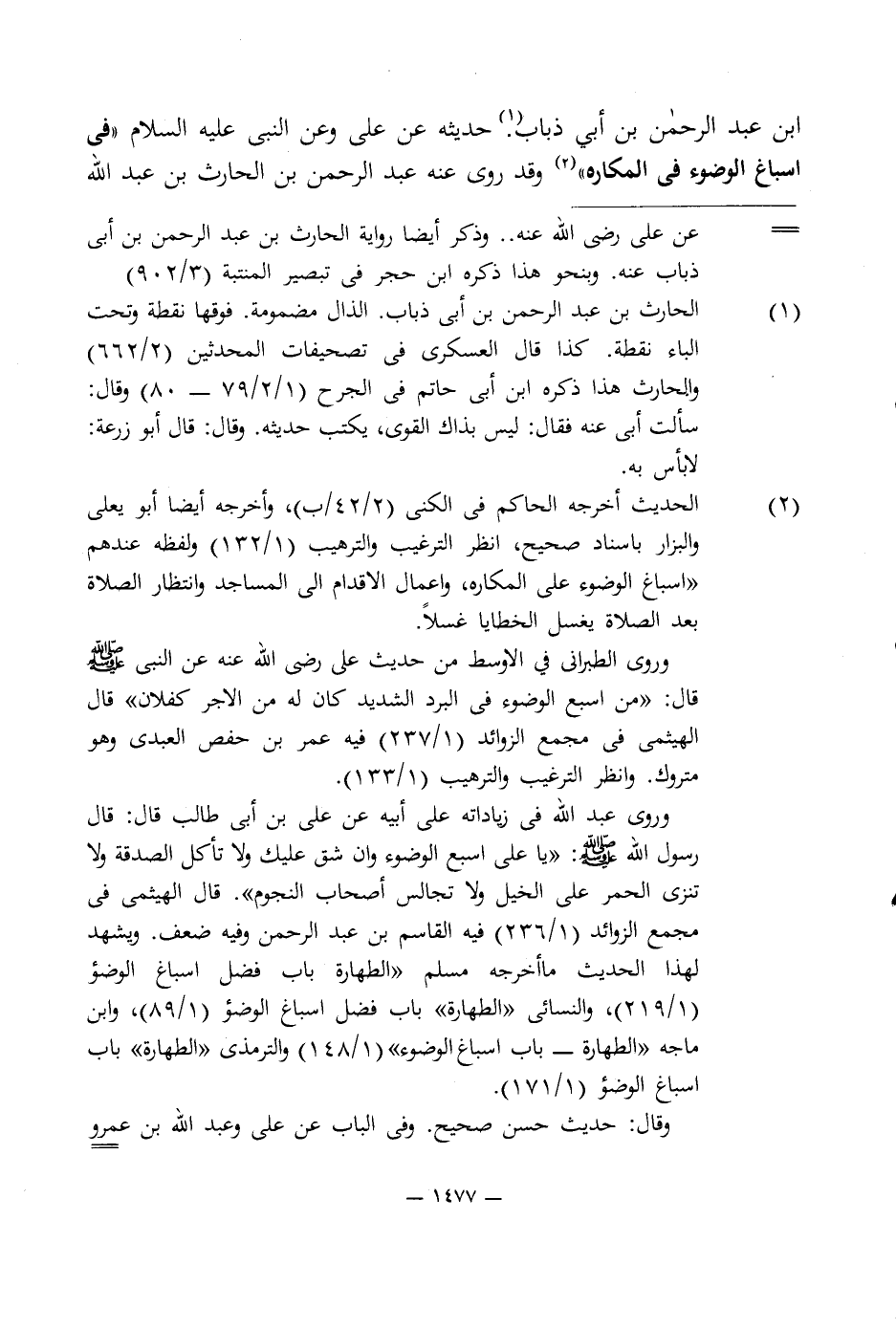 وروى عبد اللَّه في زياداته على أبيه عن على بن أبى طالب قال: قال رسول اللَّه -صلى اللَّه عليه وسلم-: "يا على اسبع الوضوء وان شق عليك ولا تأكل الصدقة ولا تنزى الحمر على الخيل ولا تجالس أصحاب النجوم". قال الهيثمى في مجمع الزوائد (1/ 236) فيه القاسم بن عبد الرحمن وفيه ضعف. ويشهد لهذا الحديث ما أخرجه مسلم "الطهارة باب فضل اسباغ الوضوء (1/ 219)، والنسائى "الطهارة" باب فضل اسباغ الوضوء (1/ 89)، وابن ماجه "الطهارة - باب اسباغ الوضوء" (1/ 148) والترمذى "الطهارة" باب اسباغ الوضوء (1/ 171).