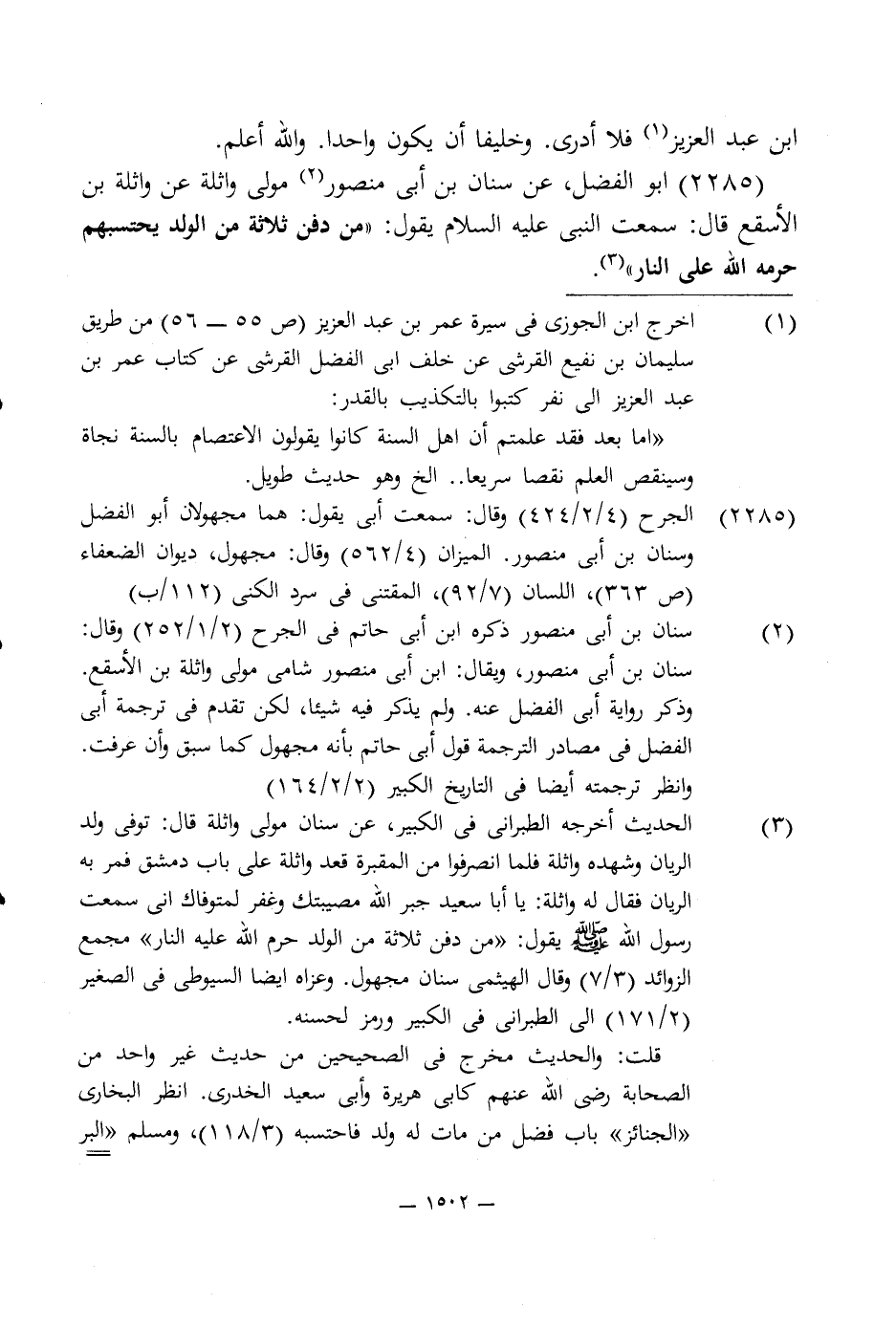 2285 - أبو الفضل، عن سنان بن أبى منصور (¬2) مولى واثلة عن واثلة بن الأسقع قال: سمعت النبى عليه السلام يقول: "من دفن ثلاثة من الولد يحتسبهم حرمه اللَّه على النار" (¬3).