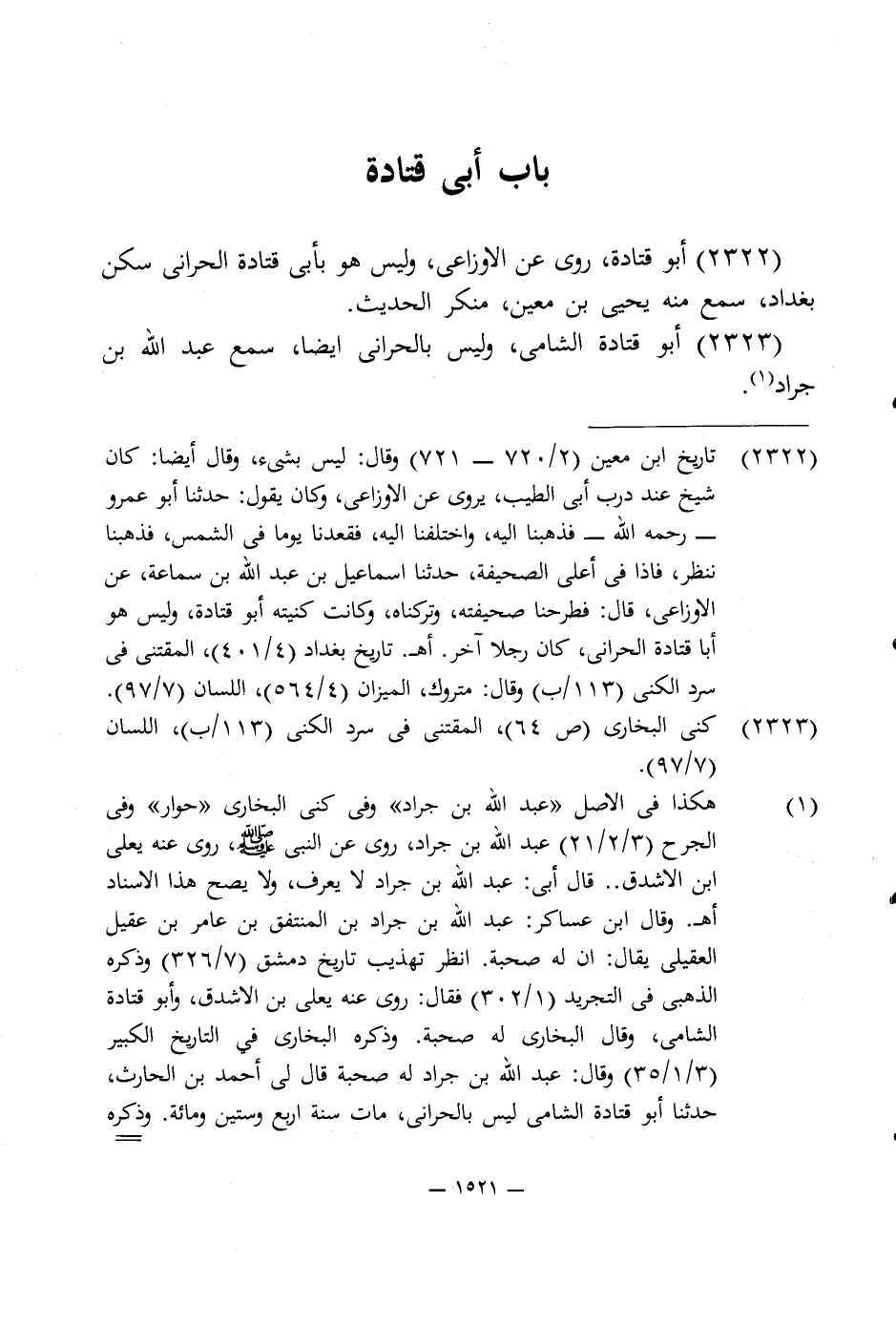 2322 - أبو قتادة، روى عن الأوزاعى، وليس هو بأبى قتادة الحرانى سكن بغداد، سمع منه يحيى بن معين، منكر الحديث.