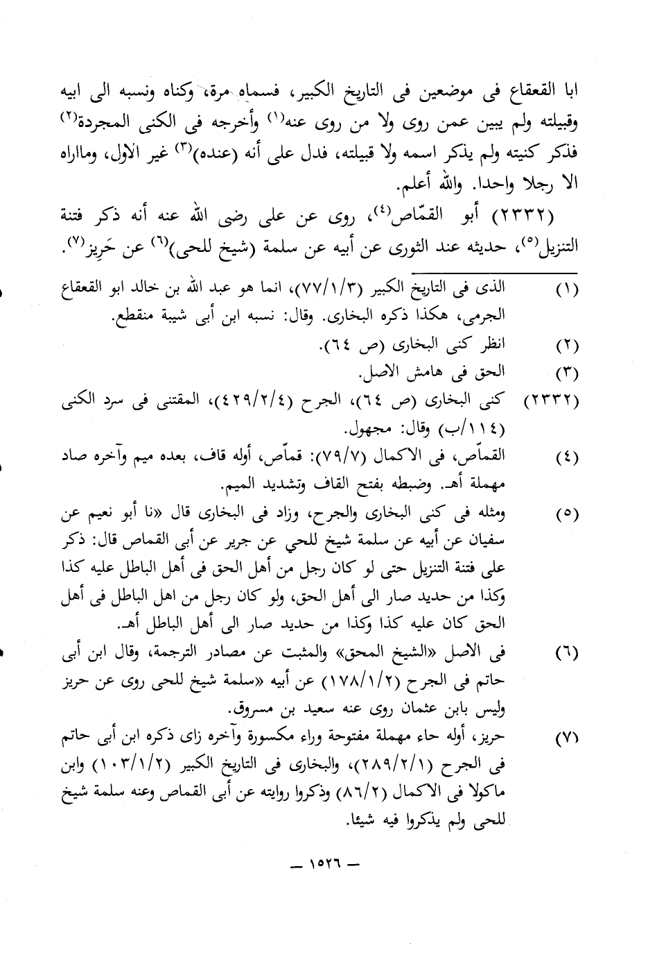 2332 - أبو القمّاص (¬4)، روى عن على رضى اللَّه عنه أنه ذكر فتنة التنزيل (¬5)، حديثه عند الثورى عن أبيه عن سلمة (شيخ للحى) (¬6) عن حَرِيز (¬7).
