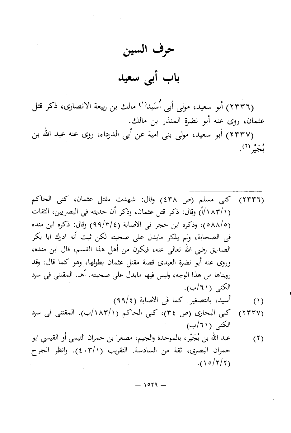 2336 - كنى مسلم (ص 438) وقال: شهدت مقتل عثمان، كنى الحاكم (1/ 183/ أ) وقال: ذكر قتل عثمان، وذكر أن حديثه في البصريين، الثقات (5/ 588)، وذكره ابن حجر في الإصابة (4/ 3/ 99) وقال: ذكره ابن منده في الصحابة، ولم يذكر ما يدل على صحبته لكن ثبت أنه أدرك أبا بكر الصديق رضى اللَّه تعالى عنه، فيكون من أهل هذا القسم، قال ابن منده، وروى عنه أبو نضرة العبدى قصة مقتل عثمان بطولها، وهو كما قال: وقد رويناها من هذا الوجه، وليمر فيها مايدل على صحبته. اهـ. المقتنى في سرد الكنى (61/ ب).