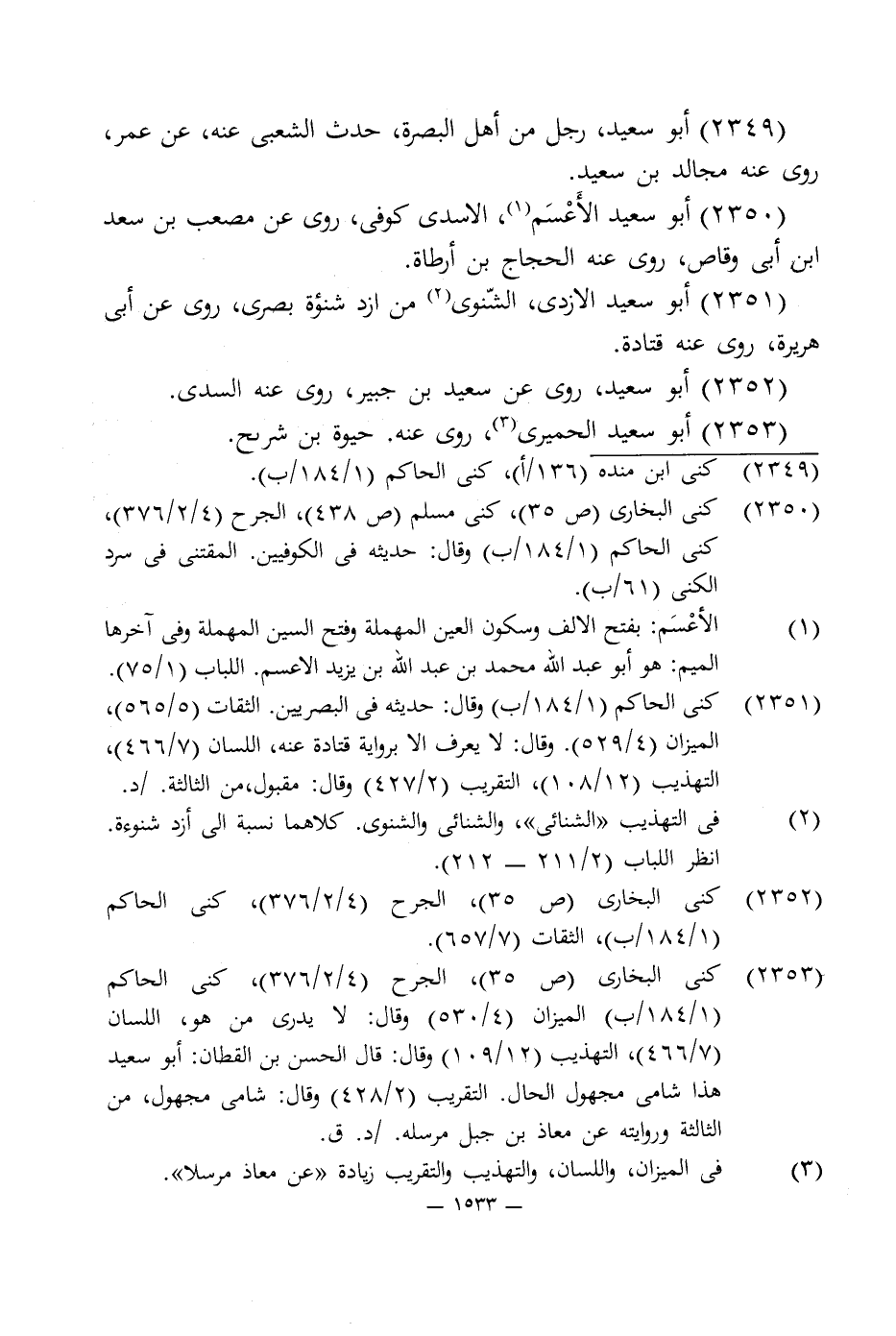 2353 - كنى البخارى (ص 35)، الجرح (4/ 2/ 376)، كنى الحاكم (1/ 184/ ب) الميزان (4/ 530) وقال: لا يدرى من هو، اللسان (7/ 466)، التهذيب (12/ 109) وقال: قال الحسن بن القطان: أبو سعيد هذا شامى مجهول الحال. التقريب (2/ 428) وقال: شامى مجهول، من الثالثة وروايته عن معاذ بن جبل مرسله./ د. ق.
