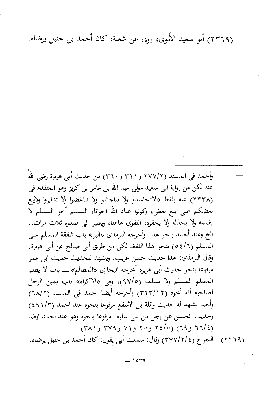 = وأحمد في المسند (2/ 277 و 311 و 360) من حديث أبى هريرة رضى اللَّه عنه لكن من رواية أبى سعيد مولى عبد اللَّه بن عامر بن كريز وهو المتقدم في (2338) عنه بلفظ "لا تحاسدوا ولا تناجشوا ولا تباغضوا ولا تدابروا ولا يبع بعضكم على بيع بعض، وكونوا عباد اللَّه اخوانا، المسلم أخو المسلم لا يظلمه ولا يخذله ولا يحقره، التقوى ها هنا، ويشير إلى صدره ثلاث مرات. . إلخ وعند أحمد بنحو هذا. وأخرجه الترمذى "البر" باب شفقة المسلم على المسلم (6/ 54) بنحو هذا اللفظ لكن من طريق أبى صالح عن أبى هريرة. وقال الترمذى: هذا حديث حسن غريب. ويشهد للحديث حديث ابن عمر مرفوعا بنحو حديث أبى هريرة أخرجه البخارى "المظالم" - باب لا يظلم المسلم المسلم ولا يسلمه (5/ 97)، وفى "الاكراه" باب يمين الرجل لصاحبه أنه أخوه (12/ 323) وأخرجه أيضا أحمد في المسند (2/ 68) وأيضا يشهد له حديث واثلة بن الاسقع مرفوعا بنحوه عند أحمد (3/ 491) وحديث الحسن عن رجل من بنى سليط مرفوعا بنحوه وهو عند أحمد أيضا (4/ 66 و 69) (5/ 24 و 25 و 71 و 379 و 381).