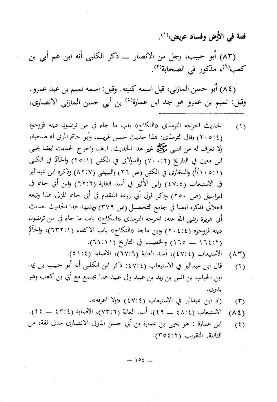84 - أبو حسن المازنى، قيل اسمه كنيته. وقيل: اسمه تميم بن عبد عمرو. وقيل: تميم بن عمرو هو جد ابن عمارة (¬4) بن أبى حسن المازنى الأنصارى،
