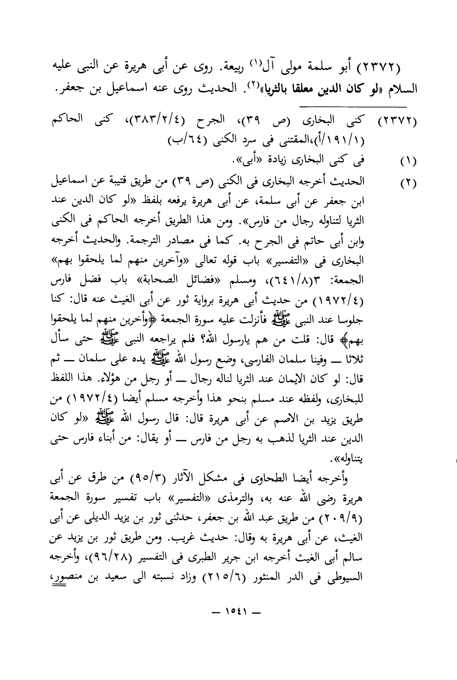 2372 - أبو سلمة مولى آل (¬1) ربيعة. روى عن أبى هريرة عن النبى عليه السلام "لو كان الدين معلقا بالثريا" (¬2). الحديث روى عنه إسماعيل بن جعفر.