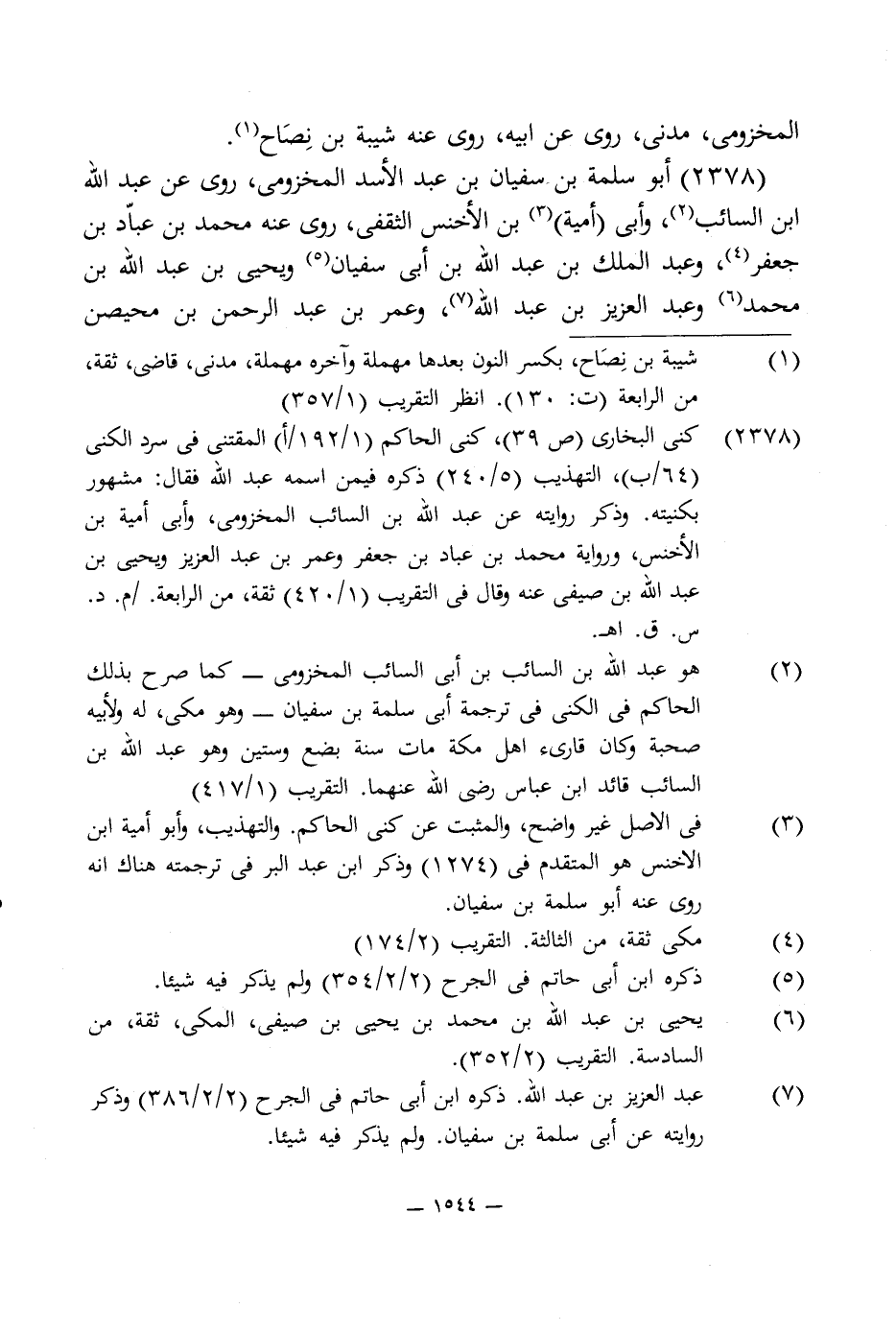 (¬7) عبد العزيز بن عبد اللَّه. ذكره ابن أبى حاتم في الجرح (2/ 2/ 386) وذكر روايته عن أبى سلمة بن سفيان. ولم يذكر فيه شيئا.