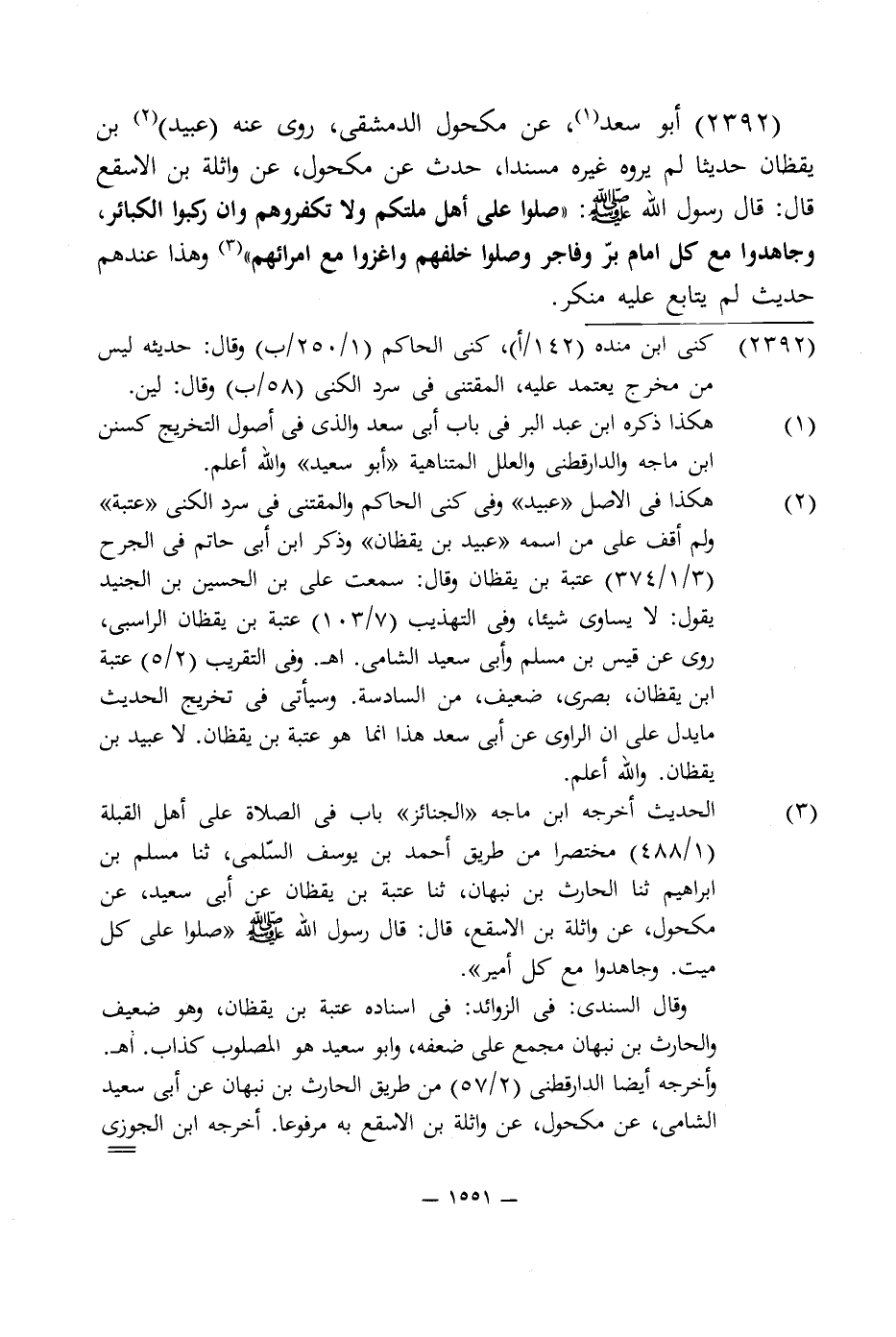 2392 - أبو سعد (¬1)، عن مكحول الدمشقى، روى عنه (عبيد) (¬2) بن يقظان حديثا لم يروه غيره مسندا، حدث عن مكحول، عن واثلة بن الأسقع قال: قال رسول اللَّه -صلى اللَّه عليه وسلم-: "صلوا على أهل ملتكم ولا تكفروهم وإن ركبوا الكبائر، وجاهدوا مع كل إمام برّ وفاجر وصلوا خلفهم واغزوا مع امرائهم" (¬3) وهذا عندهم حديث لم يتابع عليه منكر.