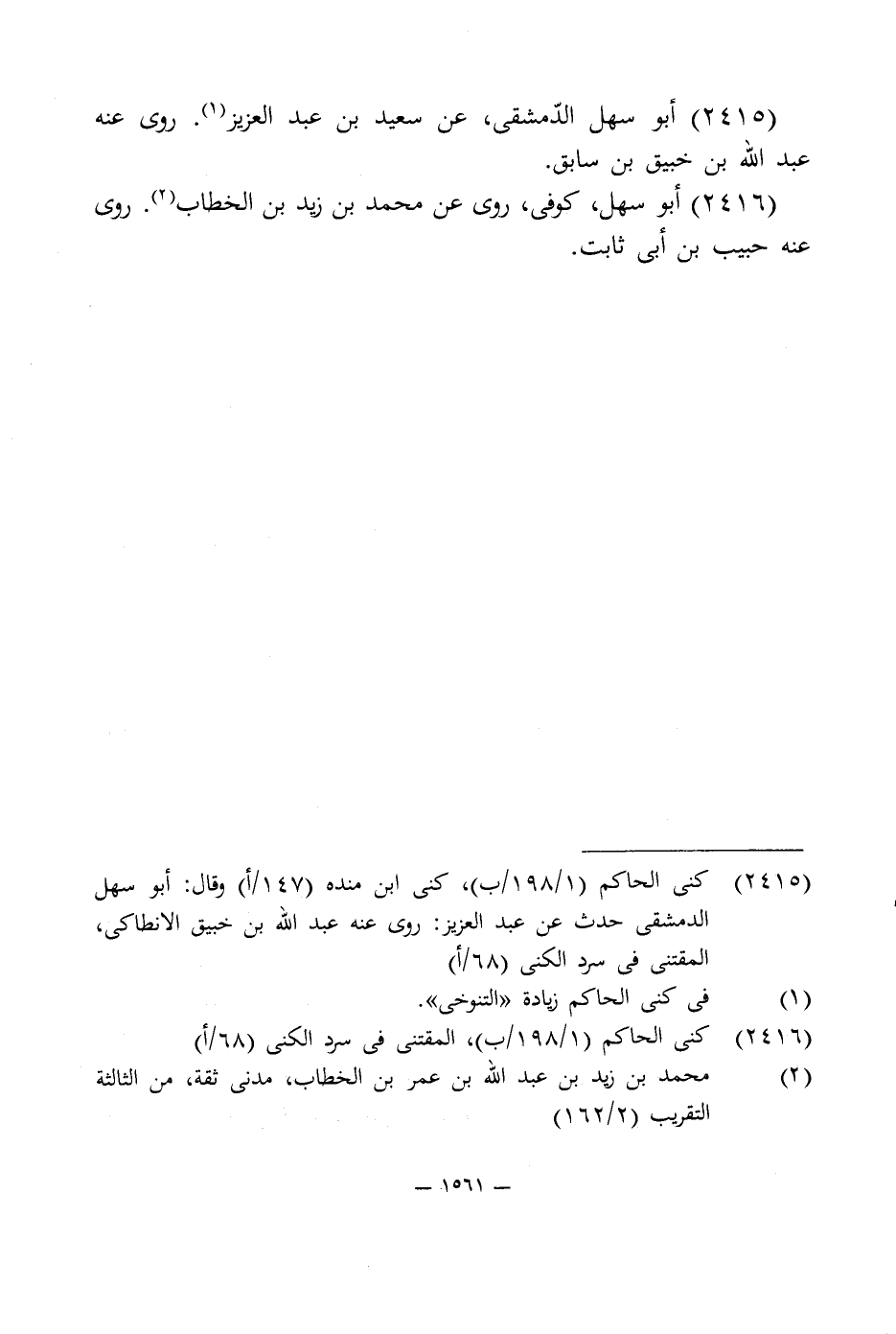 2415 - كنى الحاكم (1/ 198/ ب)، كنى ابن منده (147/ أ) وقال: أبو سهل الدمشقى حدث عن عبد العزيز: روى عنه عبد اللَّه بن خبيق الأنطاكى، المقتنى في سرد الكنى (68/ أ).