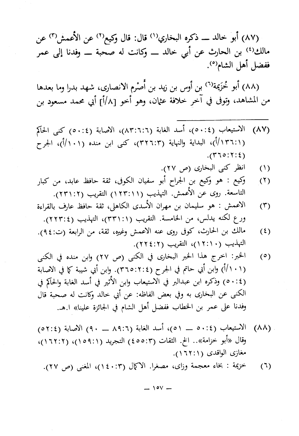 87 - أبو خالد - ذكره البخارى (¬1) قال: قال وكيع (¬2) عن الأعمش (¬3) عن مالك (¬4) بن الحارث عن أبى خالد -وكانت له صحبة- وفدنا إلى عمر ففضل أهل الشام (¬5).