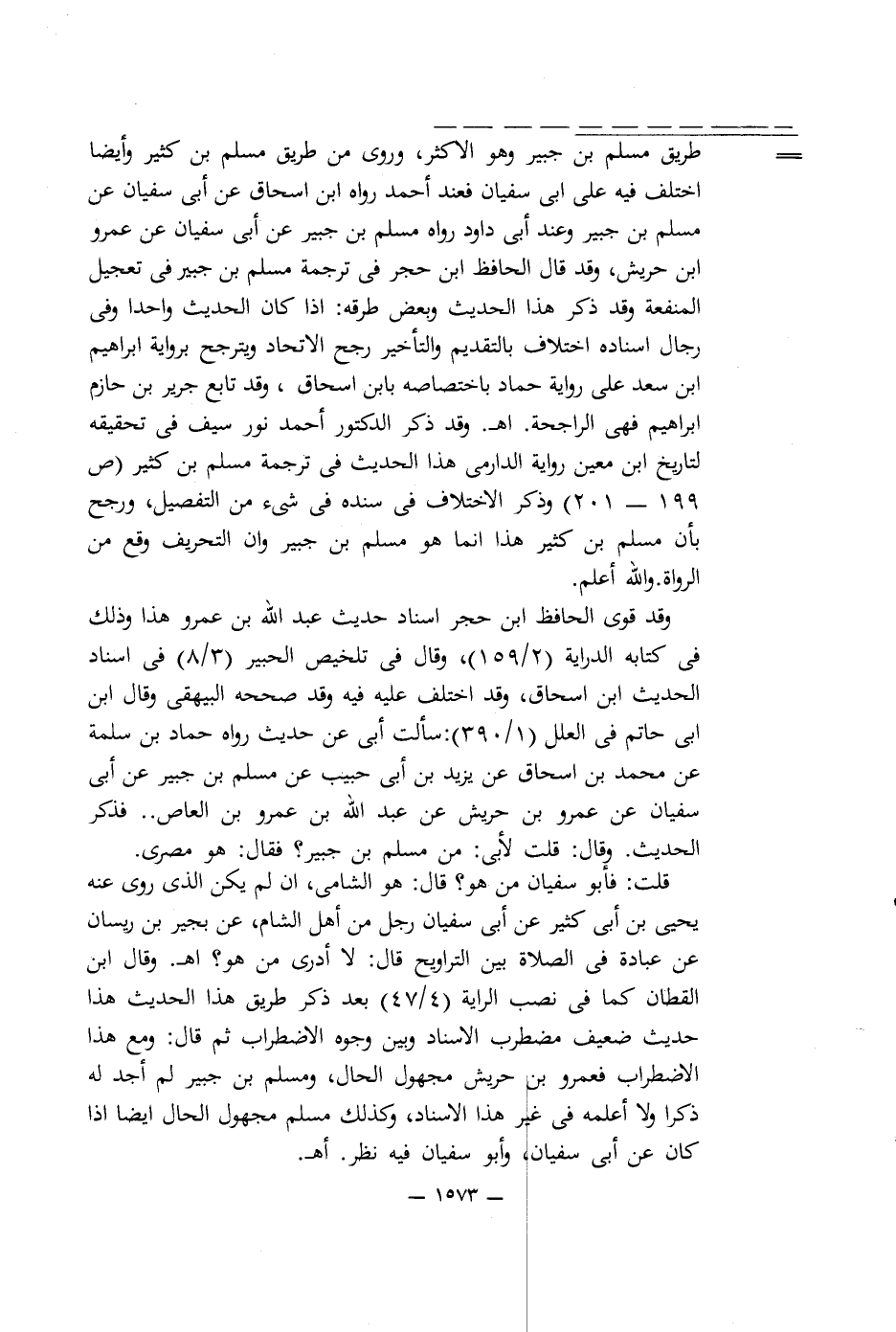وقد قوى الحافظ ابن حجر إسناد حديث عبد اللَّه بن عمرو هذا وذلك في كتابه الدراية (2/ 159)، وقال في تلخيص الحبير (3/ 8) في إسناد الحديث ابن إسحاق، وقد اختلف عليه فيه وقد صححه البيهقى وقال ابن أبى حاتم في العلل (1/ 390): سألت أبى عن حديث رواه حماد بن سلمة عن محمد بن إسحاق عن يزيد بن أبى حبيب عن مسلم بن جبير عن أبى سفيان عن عمرو بن حريش عن عبد اللَّه بن عمرو بن العاص. . فذكر الحديث. وقال: قلت لأبى: من مسلم بن جبير؟ فقال: هو مصرى.