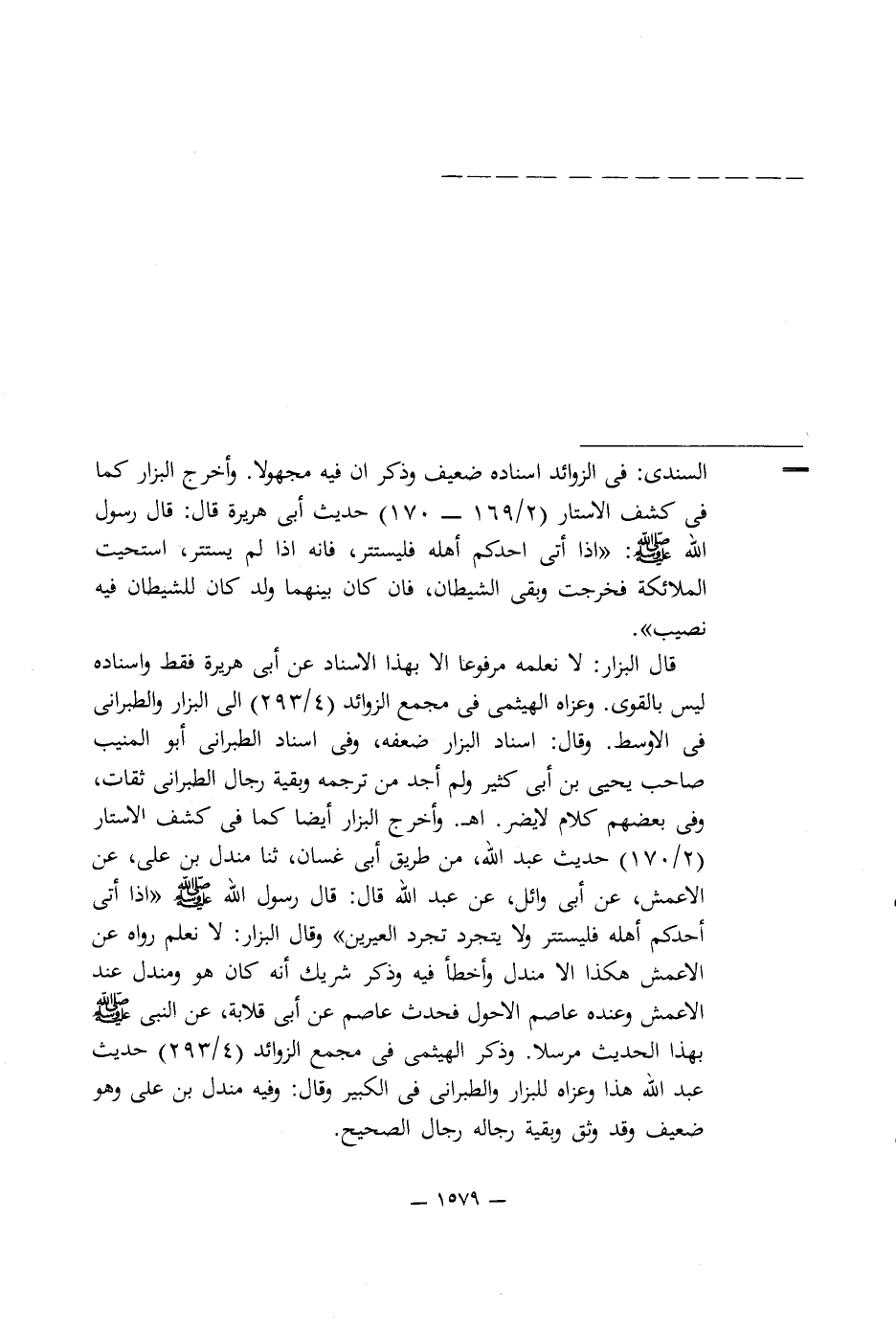 قال البزار: لا نعلمه مرفوعا إلا بهذا الإسناد عن أبى هريرة فقط وإسناده ليس بالقوى. وعزاه الهيثمى في مجمع الزوائد (4/ 293) إلى البزار والطبرانى في الأوسط. وقال: إسناد البزار ضعفه، وفى إسناد الطبرانى أبو المنيب صاحب يحيى بن أبى كثير ولم أجد من ترجمه وبقية رجال الطبرانى ثقات، وفى بعضهم كلام لا يضر. اهـ. وأخرج البزار أيضًا كما في كشف الأستار (2/ 170) حديث عبد اللَّه، من طريق أبى غسان، ثنا مندل بن على، عن الأعمش، عن أبى وائل، عن عبد اللَّه قال: قال رسول اللَّه -صلى اللَّه عليه وسلم- "إذا أتى أحدكم أهله فليستتر ولا يتجرد تجرد العيرين" وقال البزار: لا نعلم رواه عن الأعمش هكذا إلا مندل وأخطأ فيه وذكر شريك أنه كان هو ومندل عند الأعمش وعنده عاصم الأحول فحدث عاصم عن أبى قلابة، عن النبى -صلى اللَّه عليه وسلم- بهذا الحديث مرسلا. وذكر الهيثمى في مجمع الزوائد (4/ 293) حديث عبد اللَّه هذا وعزاه للبزار والطبرانى في الكبير وقال: وفيه مندل بن عدى وهو ضعيف وقد وثق وبقية رجاله رجال الصحيح.