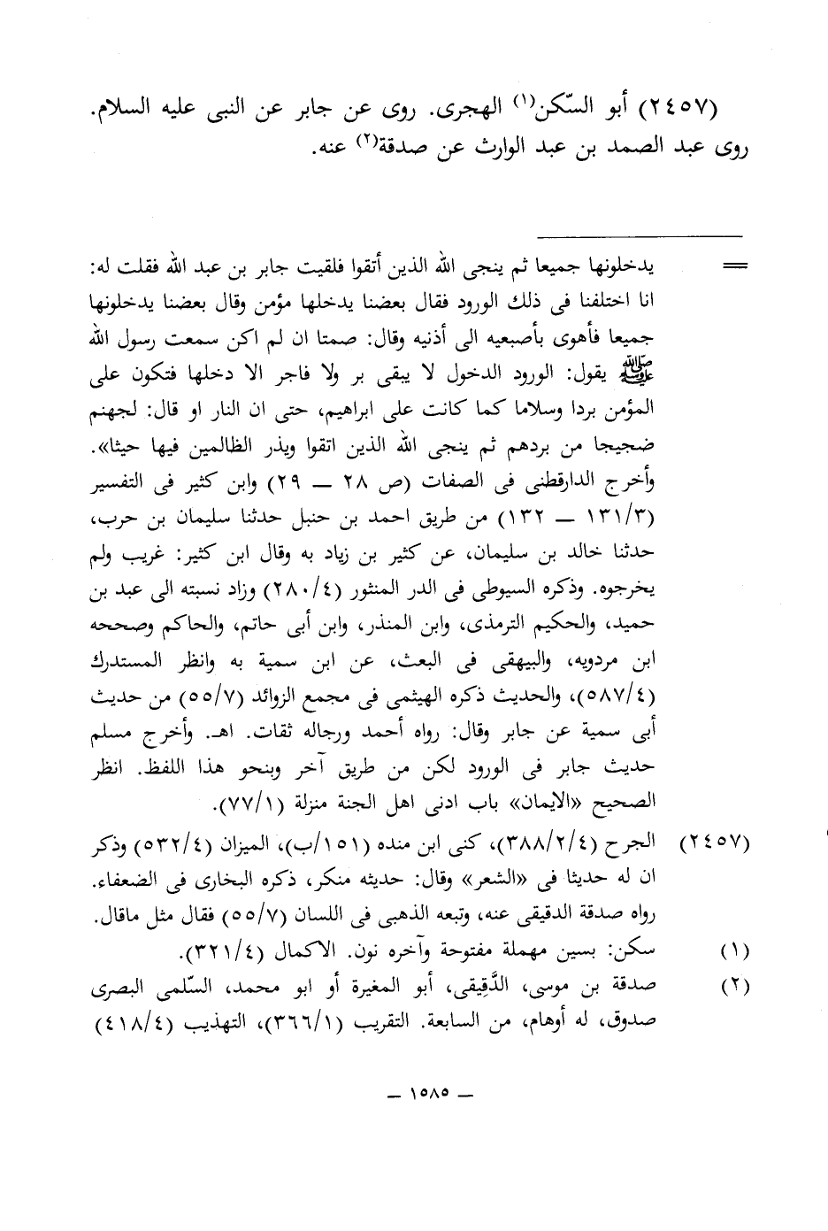 2457 - أبو السّكن (¬1) الهجرى. روى عن جابر عن النبى عليه السلام. روى الصمد بن عبد الوارث عن صدقة (¬2) عنه.