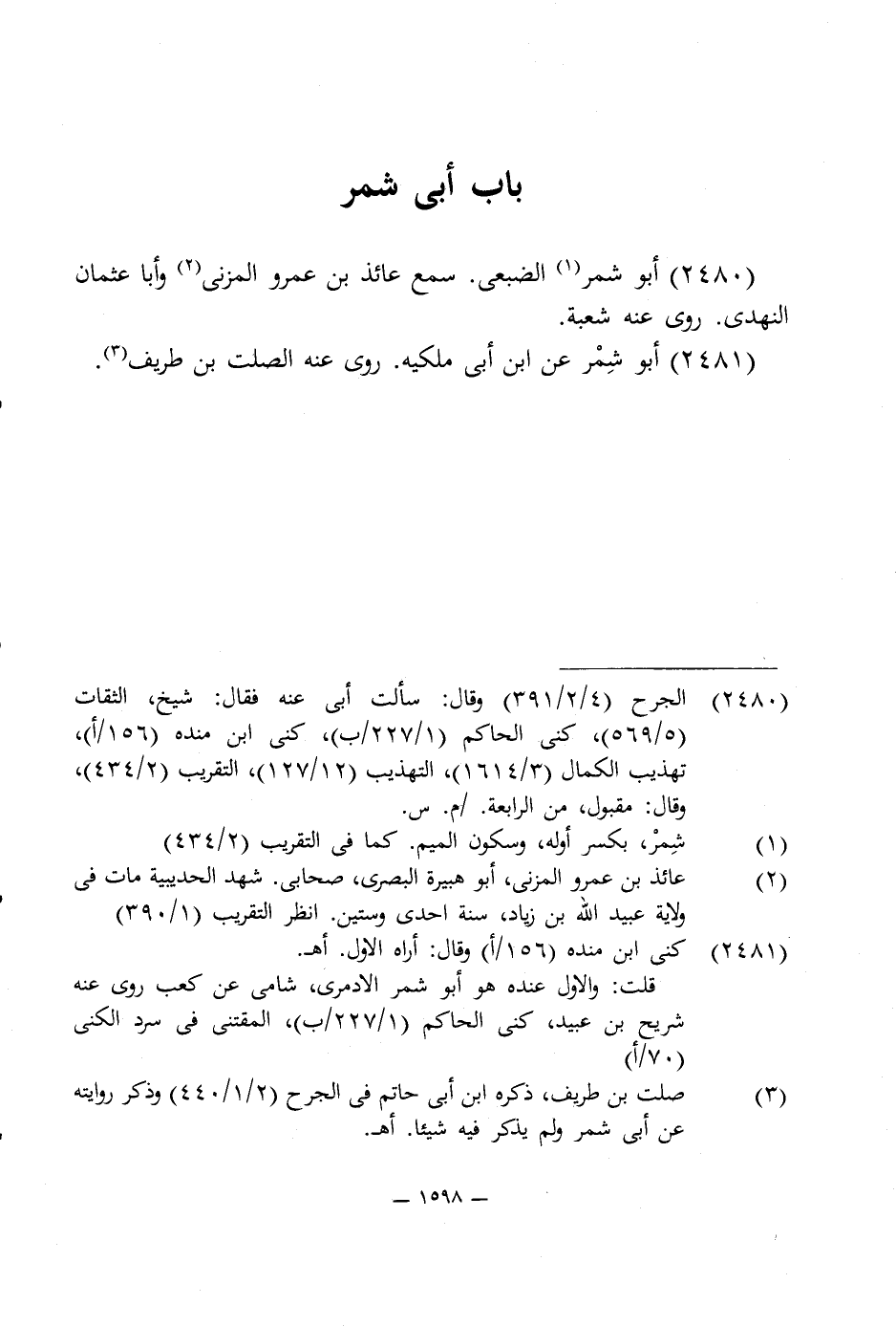 2480 - أبو شمر (¬1) الضبعى. سمع عائذ بن عمرو المزنى (¬2) وأبا عثمان النهدى. روى عنه شعبة.