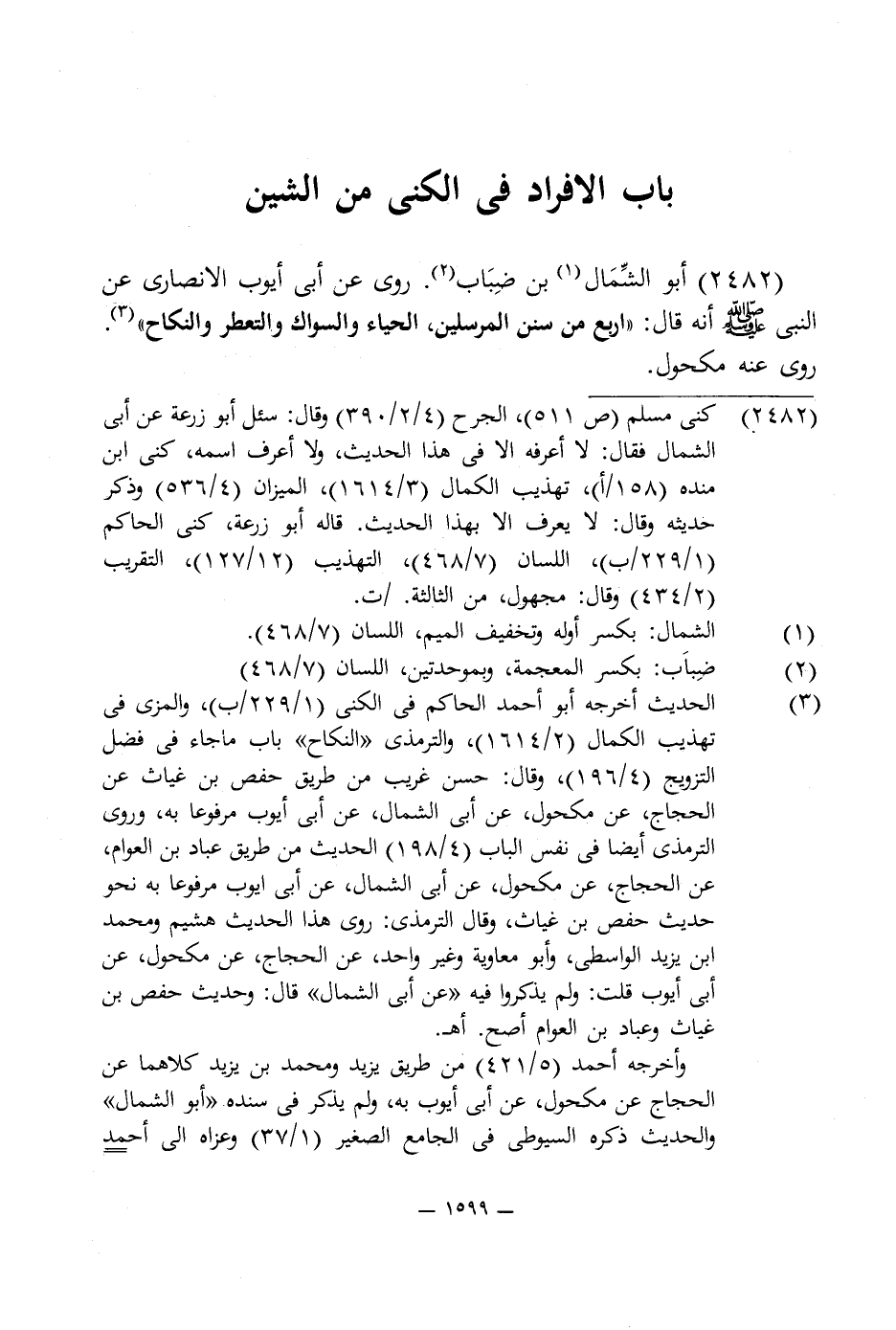 2482 - كنى مسلم (ص 511)، الجرح (4/ 2/ 390) وقال: سئل أبو زرعة عن أبى الشمال فقال: لا أعرفه إلا في هذا الحديث، ولا أعرف اسمه، كنى ابن منده (158/ أ)، تهذيب الكمال (3/ 1614)، الميزان (4/ 536) وذكر حديثه وقال: لا يعرف إلا بهذا الحديث. قاله أبو زرعة، كنى الحاكم (1/ 229/ ب)، اللسان (7/ 468)، التهذيب (12/ 127)، التقريب (2/ 434) وقال: مجهول، من الثالثة./ ت.