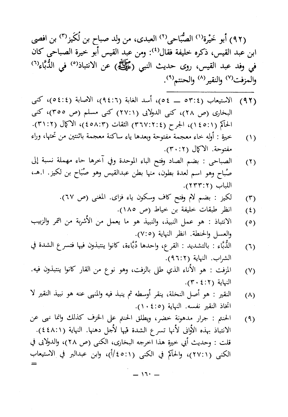92 - أبو خَيْرة (¬1) الصُّبَاحى (¬2) العبدى، من ولد صباح بن لُكَيز (¬3) بن افصى ابن عبد القيس، ذكره خليفة فقال (¬4): ومن عبد القيس أبو خيرة الصباحى كان في وفد عبد القيس، روى حديث النبى (صلى اللَّه عليه وسلم) عن الانتباذ (¬5) في الدُّبَّاء (¬6) والمزفت (¬7) والنقير (¬8) والحنتم (¬9).