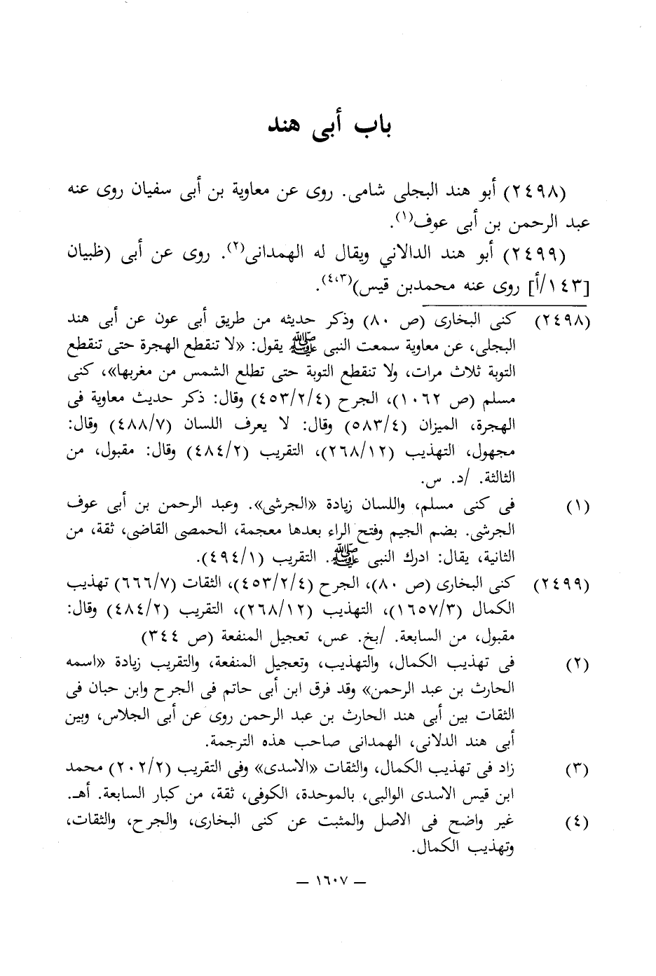 2498 - كنى البخارى (ص 80) وذكر حديثه من طريق أبى عون عن أبى هند البجلى، عن معاوية سمعت النبى -صلى اللَّه عليه وسلم- يقول: "لا تنقطع الهجرة حتى تنقطع التوبة ثلاث مرات، ولا تنقطع التوبة حتى تطلع الشمس من مغربها"، كنى مسلم (ص 1062)، الجرح (4/ 2/ 453) وقال: ذكر حديث معاوية في الهجرة، الميزان (4/ 583) وقال: لا يعرف اللسان (7/ 488) وقال: مجهول، التهذيب (12/ 268)، التقريب (2/ 484) وقال: مقبول، من الثالثة/ د. س.