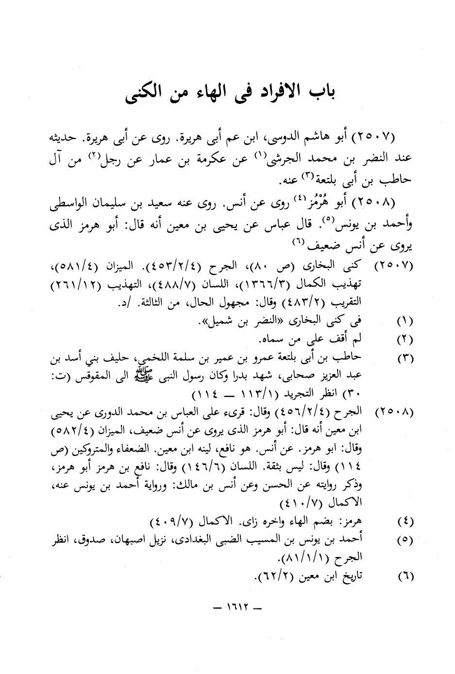 2507 - كنى البخارى (ص 80)، الجرح (4/ 2/ 453). الميزان (4/ 581)، تهذيب الكمال (3/ 1366)، اللسان (7/ 488)، التهذيب (12/ 261) التقريب (2/ 483) وقال: مجهول الحال، من الثالثة./ د.