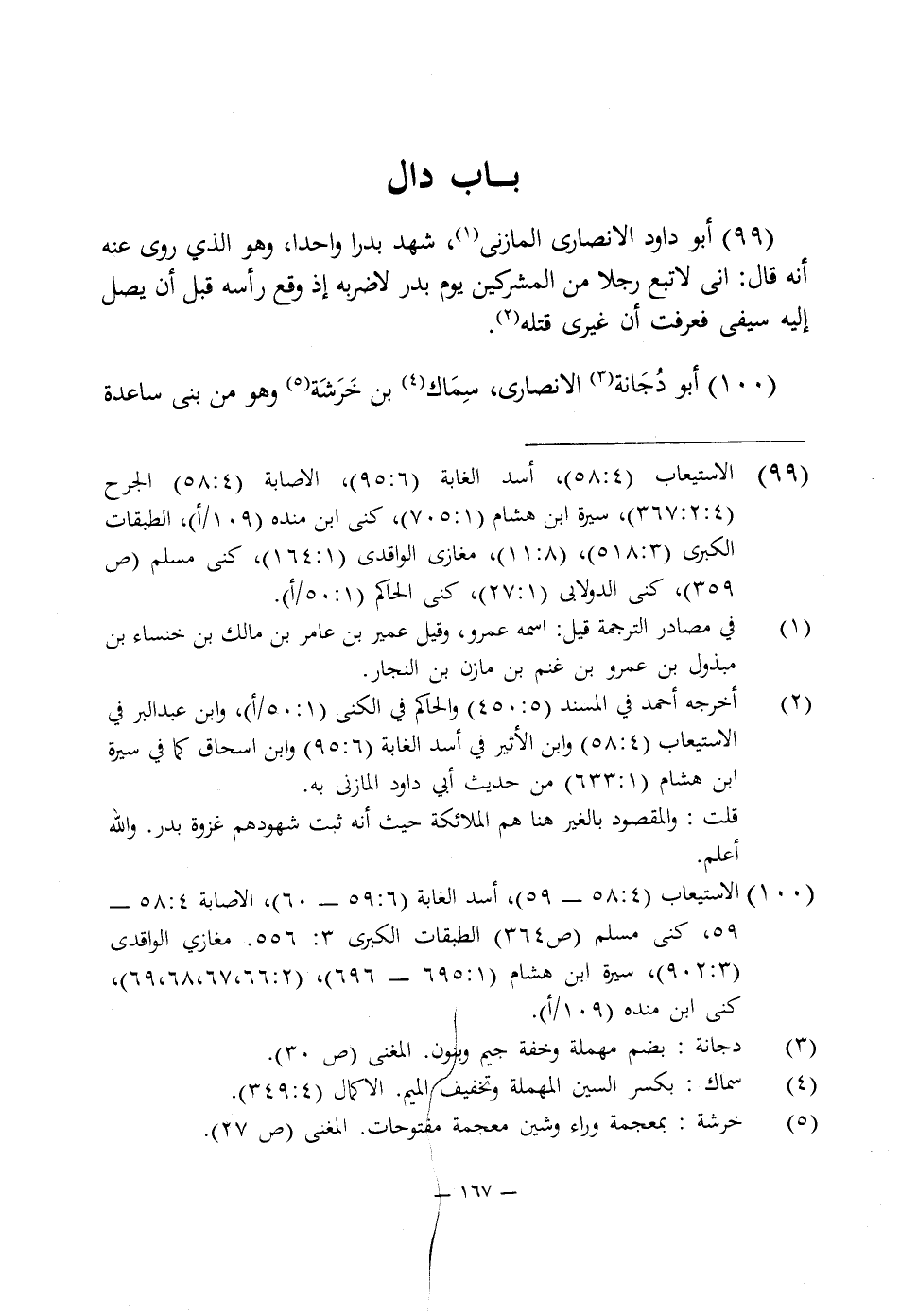 99 - أبو داود الأنصارى المازنى (¬1)، شهد بدرا واحدا، وهو الذى روى عنه أنه قال: انى لاتبع رجلا من المشركين يوم بدر لاضربه إذ وقع رأسه قبل أن يصل إليه سيفى فعرفت أن غيرى قتله (¬2).
