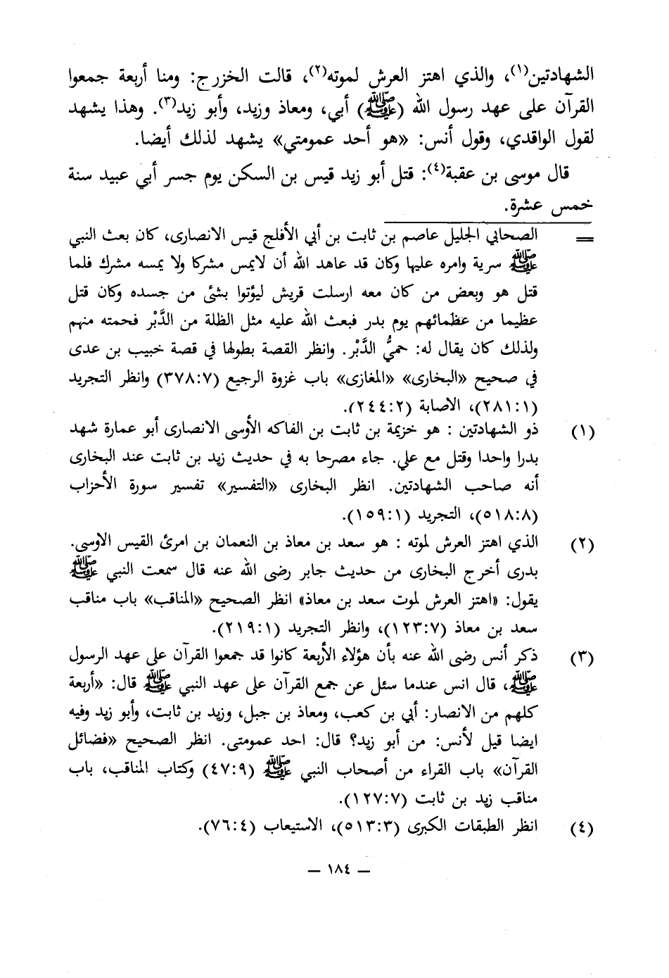 (¬3) ذكر أنس رضى اللَّه عنه بأن هؤلاء الأربعة كانوا قد جمعوا القرآن على عهد الرسول -صلى اللَّه عليه وسلم-، قال انس عندما سئل عن جمع القرآن على عهد النبى -صلى اللَّه عليه وسلم- قال: "أربعة كلهم من الأنصار: أبى بن كعب، ومعاذ بن جبل، وريد بن ثابت، وأبو زيد وفيه أيضا قيل لأنس: من أبو زيد؟ قال: أحد عمومتى. انظر الصحيح "فضائل القرآن" باب القراء من أصحاب النبى -صلى اللَّه عليه وسلم- (9: 47) وكتاب المناقب، باب مناقب زيد بن ثابت (7: 127).