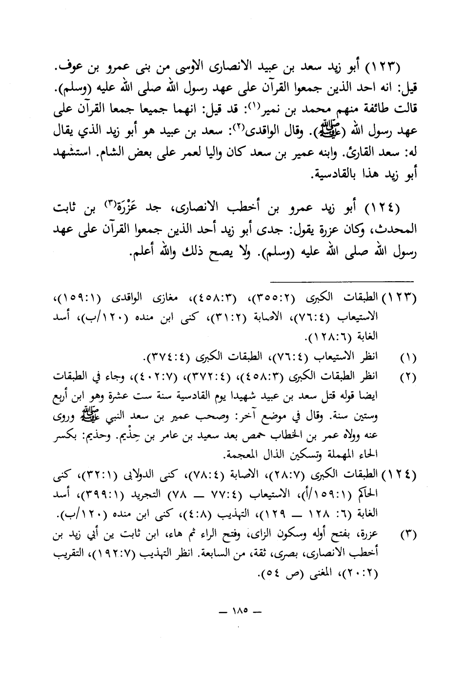 124 - أبو زيد عمرو بن أخطب الأنصارى، جد عَزْرَة (¬3) بن ثابت المحدث، وكان عزرة يقول: جدى أبو زيد أحد الذين جمعوا القرآن على عهد رسول اللَّه صلى اللَّه عليه (وسلم). ولا يصح ذلك واللَّه أعلم.