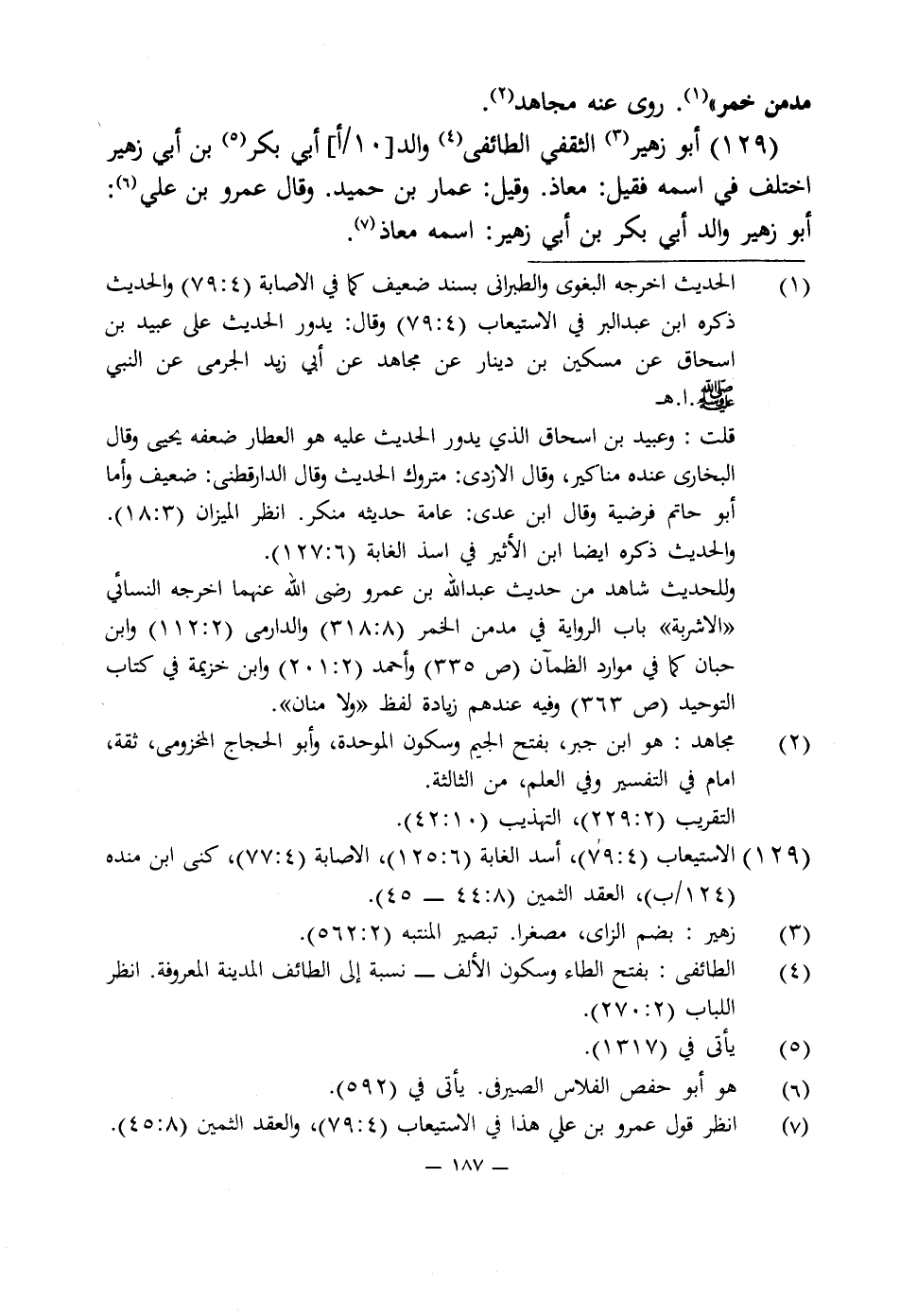 129 - أبو زهير (¬3) الثقفى الطائفى (¬4) والد أبى بكر (¬5) بن أبى زهير اختلف في اسمه فقيل: معاذ. وقيل: عمار بن حميد. وقال عمرو بن على (¬6): أبو زهير والد أبى بكر بن أبى زهير: اسمه معاذ (¬7).