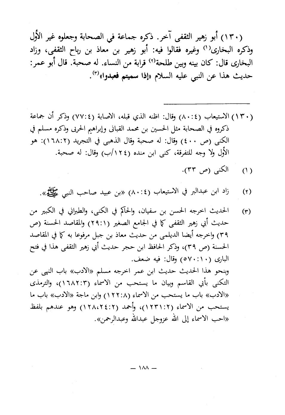 130 - أبو زهير الثقفى آخر. ذكره جماعة في الصحابة وجعلوه غير الأول وذكره البخارى (¬1) وغيره فقالوا فيه: أبو زهير بن معاذ بن رباح الثقفى، وزاد البخارى قال: كان بينه وبين طلحة (¬2) قرابة من النساء. له صحبة. قال أبو عمر: حديث هذا عن النبى عليه السلام "إذا سميتم فعبدوا" (¬3).