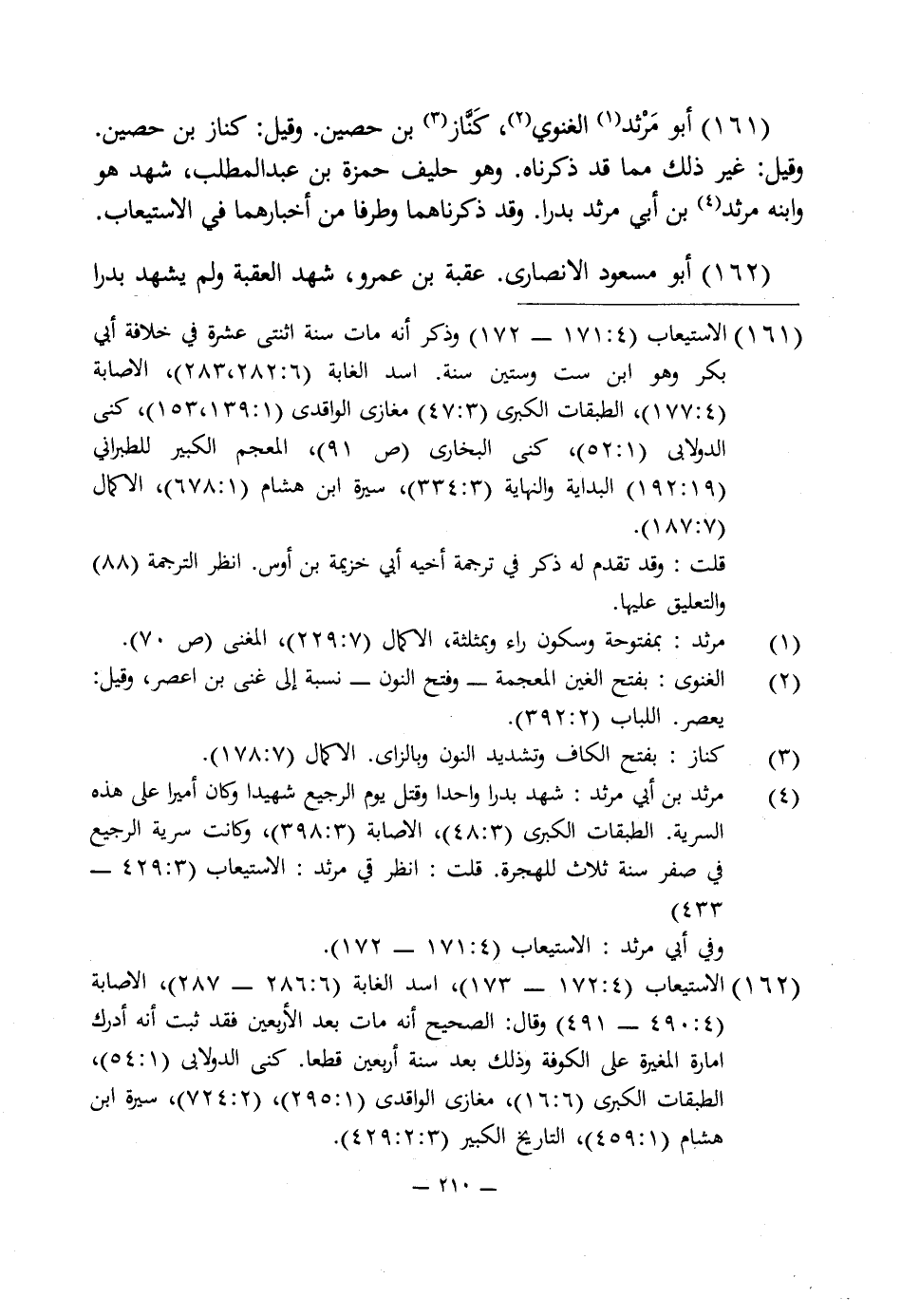 161 - أبو مَرْثد (¬1) الغنوى (¬2)، كَنَّاز (¬3) بن حصين. وقيل: كناز بن حصين. وقيل: غير ذلك مما قد ذكرناه. وهو حليف حمزة بن عبد المطلب، شهد هو وابنه مرثد (¬4) بن أبى مرثد بدرا. وقد ذكرناهما وطرفا من أخبارهما في الاستيعاب.