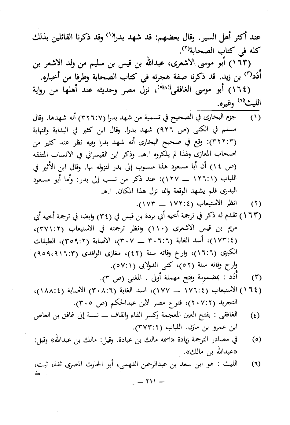 163 - تقدم له ذكر في ترجمة أخيه أبى بردة بن قيس في (34) وأيضًا في ترجمة أخيه أبى مريم بن قيس الاشعرى (110) وانظر ترجمته في الاستيعاب (2: 371)، (4: 173)، أسد الغابة (6: 306 - 307)، الإصابة (2: 359)، الطبقات الكبرى (6: 16)، وارخ وفاته سنة (42)، مغازى الواقدى (3: 916، 959) وارخ وفاته سنة (52)، كنى الدولابى (1: 57).