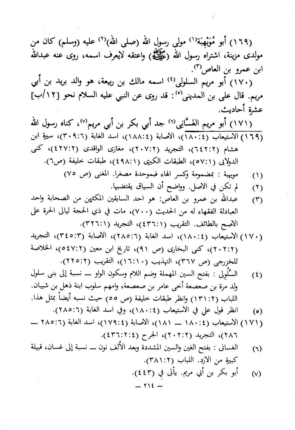 170 - الاستيعاب (4: 180)، أسد الغابة (6: 285)، الإصابة (3: 345)، التجريد (2: 202)، كنى البخارى (ص 91)، تاريخ ابن معين (2: 547)، الخلاصة للخزرجى (ص 367)، التهذيب (10: 16)، التقريب (2: 225).