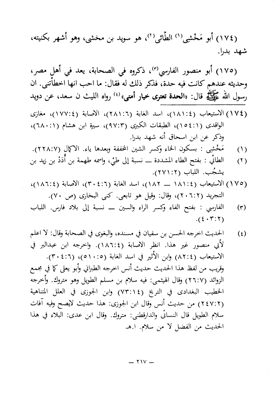 175 - أبو منصور الفارسى (¬3)، ذكروه في الصحابة، يعد في أهل مصر، وحديثه عندهم كانت فيه حدة، فذكر ذلك له فقال: ما أحب أنها اخطأتنى. أن رسول اللَّه -صلى اللَّه عليه وسلم- قال: "الحدة تعترى خيار أمتى" (¬4) رواه الليث بن سعد، عن دويد