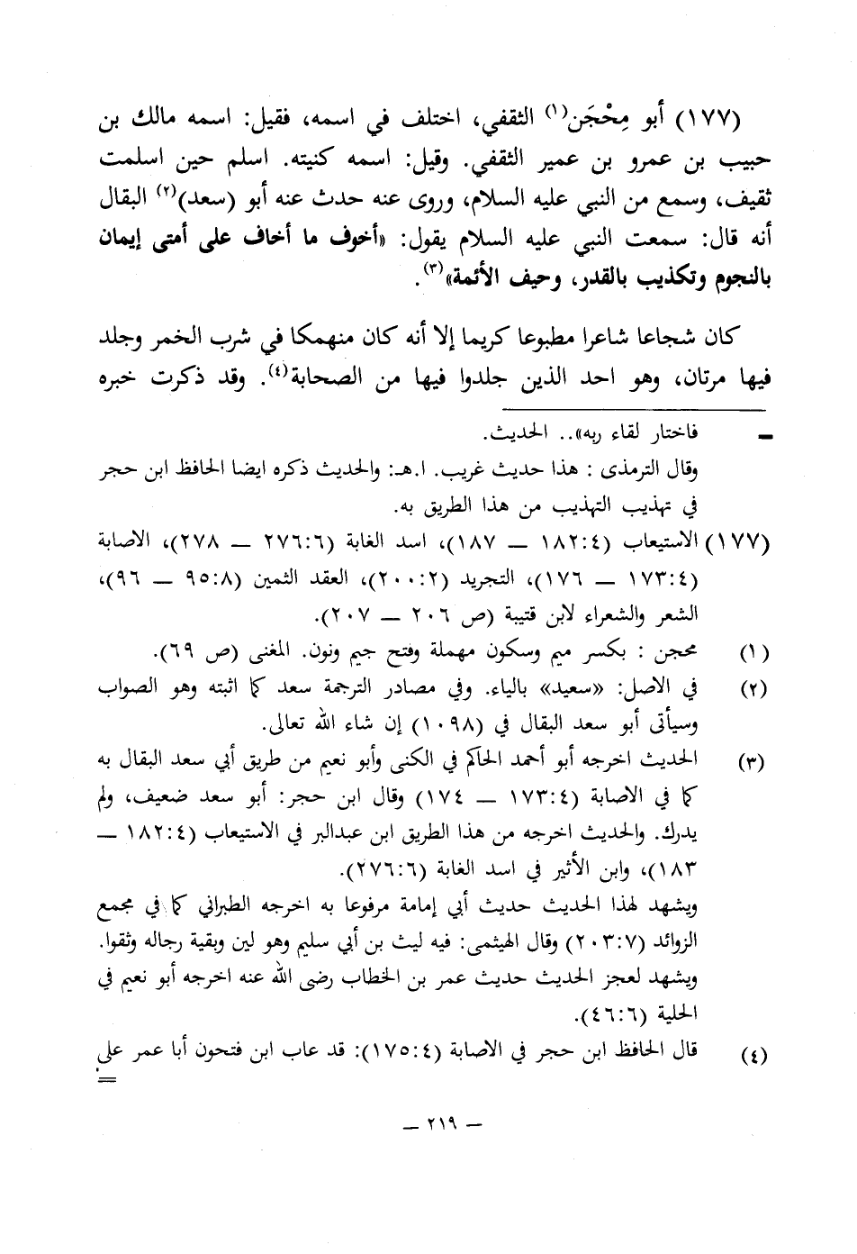 177 - أبو مِحْجَن (¬1) الثقفى، اختلف في اسمه، فقيل: اسمه مالك بن حبيب بن عمرو بن عمير الثقفى. وقيل: اسمه كنيته. أسلم حين أسلمت ثقيف، وسمع من النبى عليه السلام، وروى عنه حدث عنه أبو (سعد) (¬2) البقال أنه قال: سمعت النبى عليه السلام يقول: "أخوف ما أخاف على أمتى إيمان بالنجوم وتكذيب بالقدر، وحيف الأئمة" (¬3).