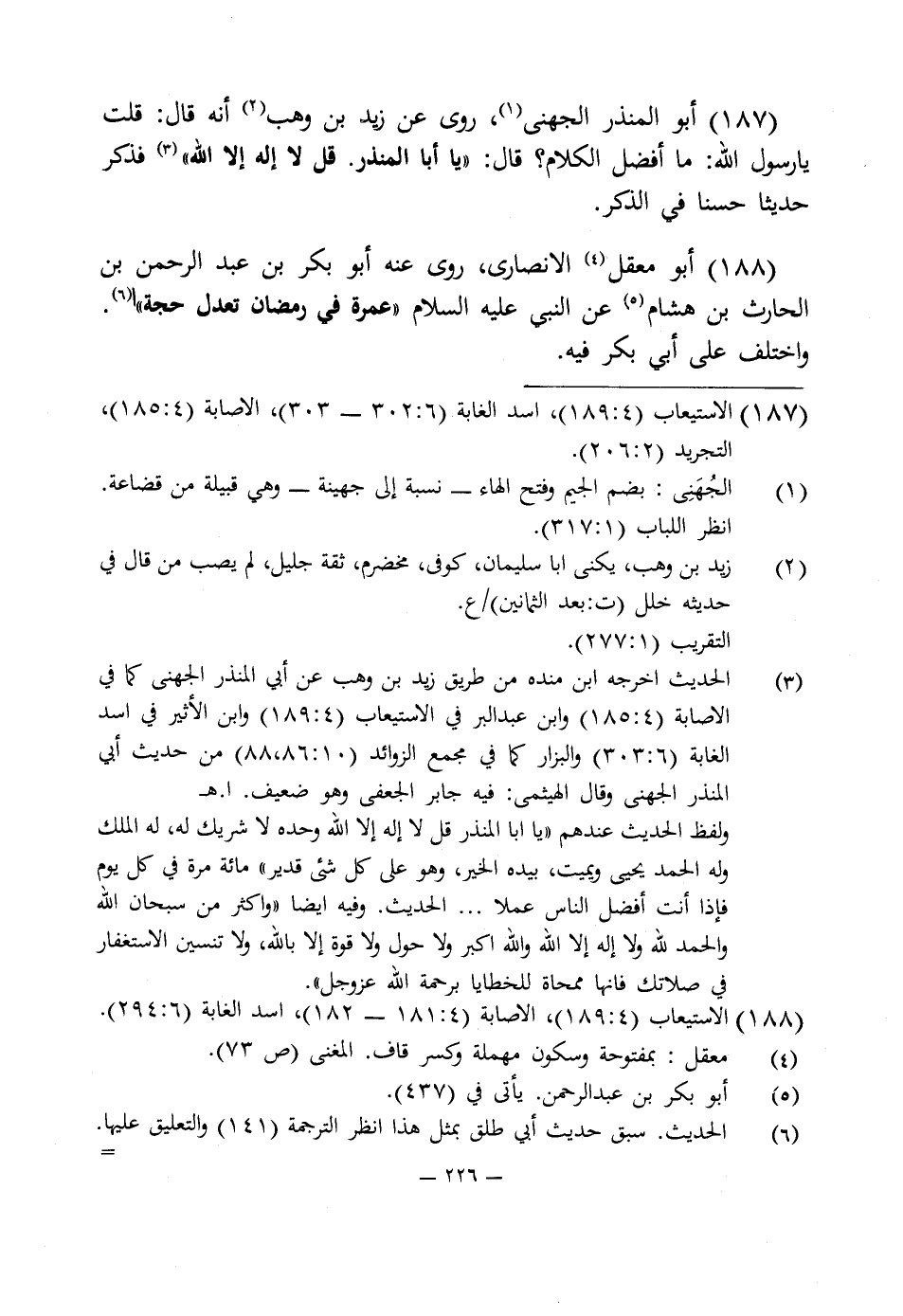 187 - أبو المنذر الجهنى (¬1)، روى عن زيد بن وهب (¬2) أنه قال: قلت يا رسول اللَّه: ما أفضل الكلام؟ قال: "يا أبا المنذر. قل لا إله إلا اللَّه" (¬3) فذكر حديثا حسنا في الذكر.