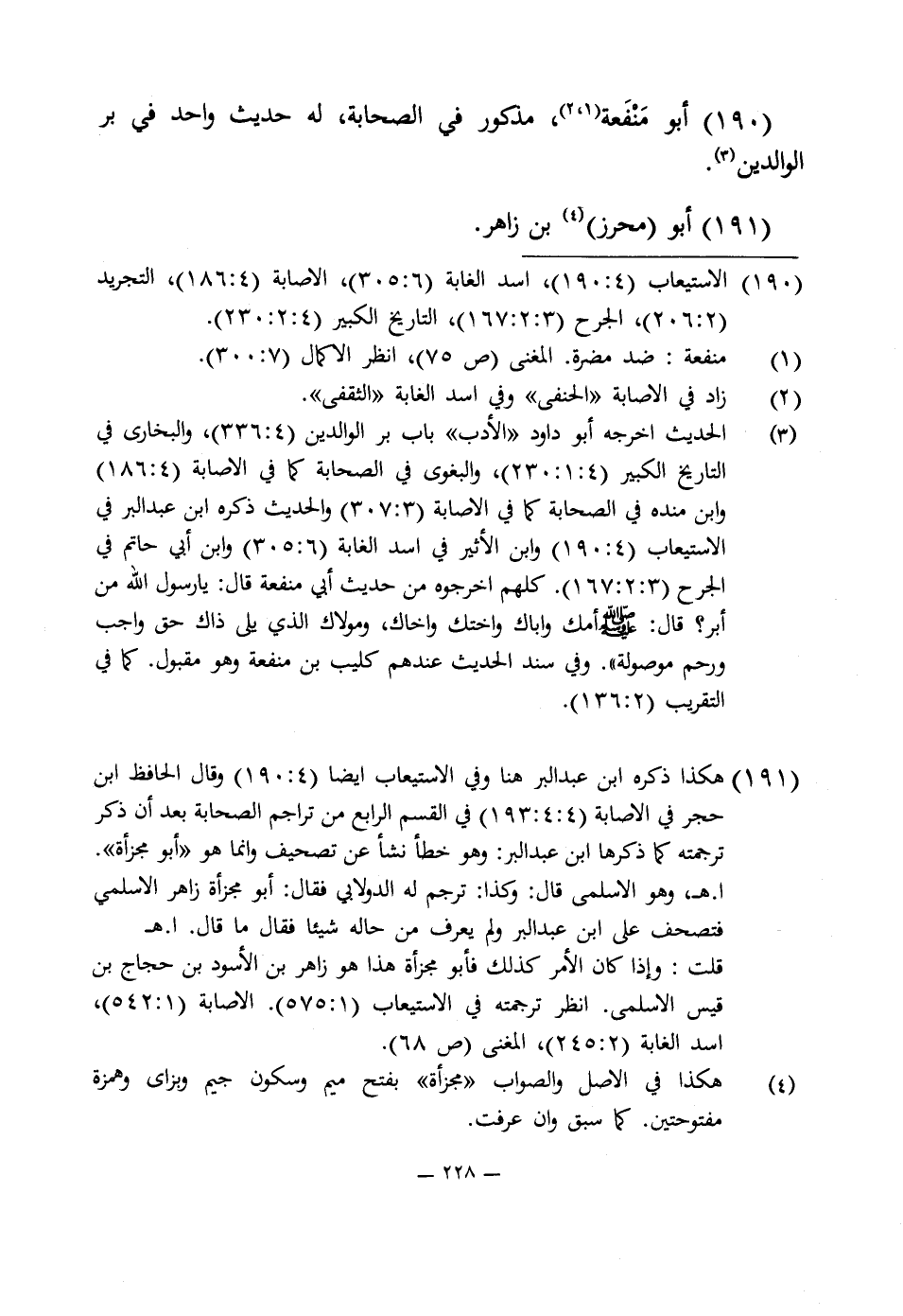191 - هكذا ذكره ابن عبد البر هنا وفى الاستيعاب أيضًا (4: 190) وقال الحافظ ابن حجر في الإصابة (4: 4: 193) في القسم الرابع من تراجم الصحابة بعد أن ذكر ترجمته كما ذكرها ابن عبد البر: وهو خطأ نشأ عن تصحيف وإنما هو "أبو مجزأة". ا. هـ، وهو الأسلمى قال: وكذا: ترجم له الدولابى فقال: أبو مجزأة زاهر الأسلمى فتصحف على ابن عبد البر ولم يعرف من حاله شيئا فقال ما قال. ا. هـ